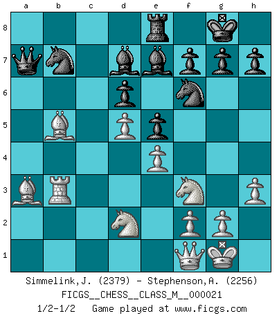Last move : 1/2-1/2 2008 November 13 13:22:4 [Event "FICGS__CHESS__CLASS_M__000021"] [Site "FICGS"] [Date "2008.07.12"] [Round "1"] [White "Simmelink,Joop"] [Black "Stephenson,Andrew"] [Result "1/2-1/2"] [WhiteElo "2379"] [BlackElo "2256"] 1.e4 e5 2.Nf3 Nc6 3.Bb5 a6 4.Ba4 Nf6 5.O-O Be7 6.Re1 b5 7.Bb3 d6 8.c3 O-O 9.h3 Na5 10.Bc2 c5 11.d4 Qc7 12.Nbd2 Nc6 13.d5 Nd8 14.a4 Rb8 15.b4 Bd7 16.bxc5 Qxc5 17.axb5 axb5 18.Ba3 Qxc3 19.Re3 Qc7 20.Bb4 Rc8 21.Rc3 Qb6 22.Rxc8 Bxc8 23.Bd3 Re8 24.Ba5 Qb8 25.Rb1 Qa7 26.Bb4 Bd7 27.Qf1 Qb6 28.Ba3 Qa7 29.Rb3 Nb7 30.Bxb5 1/2-1/2 Ruy Lopez : Closed Kingside Castling by player White (move 5) Kingside Castling by player Black (move 8) This chess game ended in a draw. Follow this game move after move (download)When the Chess game is over, the Pawn and the King go back to the same box. (Irish saying) Garry Kasparov war erst in der Großmeister-Organisation GMA, dann in der Profischach-Vereinigung PCA, zum Schluss kehrte er wieder in den Schoß der FIDE zurück. Aber gut, manche Leute sind flexibel (Viswanathan Anand) Las ideas audaces son como las piezas del Ajedrez que avanzan hacia adelante. Ellas pueden ser vencidas, pero también pueden iniciar una partida victoriosa. (Goethe) Ce n'est pas pour s'amuser qu'il joue aux échecs : il célèbre un culte. (Vladimir Nabokov) It is not enough to be a good player... you must also play well. (Siegbert Tarrasch)
