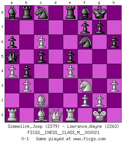 Last move : 0-1 2008 August 25 17:37:55 [Event "FICGS__CHESS__CLASS_M__000021"] [Site "FICGS"] [Date "2008.07.12"] [Round "1"] [White "Simmelink,Joop"] [Black "Lowrance,Wayne"] [Result "0-1"] [WhiteElo "2379"] [BlackElo "2263"] 1.e4 e5 2.Nf3 Nc6 3.Bb5 a6 4.Ba4 Nf6 5.O-O Bd6 6.Re1 O-O 7.c3 b5 8.Bc2 Bb7 9.d4 Re8 10.Nbd2 h6 11.h3 Rb8 12.a3 Bf8 13.d5 Na7 14.Nb3 Nc8 15.Na5 Ba8 16.a4 b4 17.c4 d6 18.c5 dxc5 19.b3 c6 20.dxc6 Qxa5 0-1 Ruy Lopez : 5.O-O Kingside Castling by player White (move 5) Kingside Castling by player Black (move 6) Player Black won this chess game. Follow this game move after move (download)Only sissies Castle. (Rob Sillars) Über Karpov: Er war und ist ein Vertreter der russischen Reaktionäre. Das steckt tief in seiner Seele, wehalb ich nicht nett mit ihm umgehen kann. (Viktor Kortschnoi) ¿Porque tengo que perder ante este idiota?. (Aron Nimzovich) Horreur, mais aussi harmonie suprême : qu'y avait-il en effet au monde en dehors des échecs ? Le brouillard, l'inconnu, le non-être... (Vladimir Nabokov) Once you start thinking you have nothing left to learn, you have everything to learn. (Steve Badget)