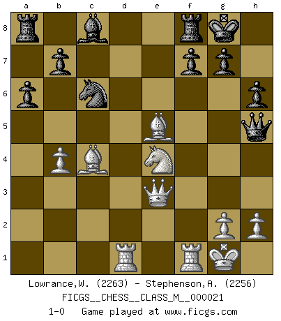 Last move : 1-0 2009 February 10 8:57:49 [Event "FICGS__CHESS__CLASS_M__000021"] [Site "FICGS"] [Date "2008.07.12"] [Round "1"] [White "Lowrance,Wayne"] [Black "Stephenson,Andrew"] [Result "1-0"] [WhiteElo "2263"] [BlackElo "2256"] 1.e4 c5 2.Nf3 d6 3.d4 cxd4 4.Nxd4 Nf6 5.Nc3 a6 6.Bg5 e6 7.f4 Qb6 8.Qd2 Qxb2 9.Rb1 Qa3 10.e5 dxe5 11.fxe5 Nfd7 12.Ne4 h6 13.Bh4 Qxa2 14.Rd1 Qd5 15.Qe3 Bc5 16.Nxe6 Bb4+ 17.c3 Qxe6 18.cxb4 O-O 19.Be2 Nc6 20.O-O Qxe5 21.Bc4 Qh5 22.Bg3 Nde5 23.Bxe5 1-0 This chess game has been lost on time (started : 2008.07.12 22:42:37) Sicilian : Najdorf, 7...Qb6 Kingside Castling by player Black (move 18) Kingside Castling by player White (move 20) Player White won this chess game. Follow this game move after move (download)Every Chess master was once a beginner. (Chernev) Den Ruhm habe ich schon, jetzt brauche ich noch das Geld. (Wilhelm Steinitz) El Ajedrez es el gimnasio de la mente. (Blaise Pascal) Votre seul travail dans les ouvertures est d'obtenir un milieu de partie jouable. (Lajos Portish) Humor is by far the most significant activity of the human brain. (Edward De Bono)