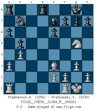 Last move : 0-1 2009 January 11 18:34:37 [Event "FICGS__CHESS__CLASS_M__000021"] [Site "FICGS"] [Date "2008.07.12"] [Round "1"] [White "Stephenson,Andrew"] [Black "Drazkowski,Krzysztof"] [Result "0-1"] [WhiteElo "2256"] [BlackElo "2376"] 1.d4 Nf6 2.c4 e6 3.g3 d5 4.Bg2 Bb4+ 5.Nc3 O-O 6.a3 Be7 7.Nf3 dxc4 8.Qa4 a6 9.Qxc4 b5 10.Qd3 Bb7 11.Be3 Nbd7 12.O-O c5 13.dxc5 Nxc5 14.Qxd8 Rfxd8 15.b4 Nce4 16.Nxe4 Nxe4 17.Ng5 Nd6 18.Bxb7 Nxb7 0-1 This chess game has been lost on time (started : 2008.07.12 22:42:37) Catalan : Closed Kingside Castling by player Black (move 5) Kingside Castling by player White (move 12) Player Black won this chess game. Follow this game move after move (download)Whoever sees no other aim in the game than that of giving checkmate to one's opponent will never become a good Chess player. (Euwe) Darum geht es im Schach. Einen Tag gibst du deinem Gegner eine Lektion, am nächsten Tag gibt er dir eine. (Robert James Fischer) El Ajedrez es una guerra en un tablero. El objetivo es aplastar la mente del oponente. (Bobby Fischer) Il s'avisa de me proposer d'apprendre les échecs qu'il jouait un peu... me voilà forcené des échecs. J'achète un échiquier, je m'enferme dans ma chambre, j'y passe des jours et des nuits à vouloir apprendre par cur toutes les parties. (Jean-Jacques Rousseau, Confessions) The only difference between a tax man and a taxidermist is that the taxidermist leaves the skin. (Mark Twain)