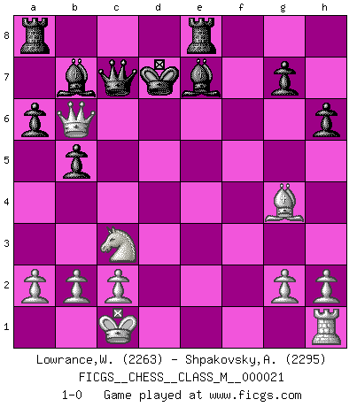 Last move : 1-0 2008 September 27 19:53:23 [Event "FICGS__CHESS__CLASS_M__000021"] [Site "FICGS"] [Date "2008.07.12"] [Round "1"] [White "Lowrance,Wayne"] [Black "Shpakovsky,Alexander"] [Result "1-0"] [WhiteElo "2263"] [BlackElo "2295"] 1.e4 c5 2.Nf3 d6 3.d4 cxd4 4.Nxd4 Nf6 5.Nc3 a6 6.Bg5 e6 7.f4 Be7 8.Qf3 h6 9.Bh4 Qc7 10.O-O-O Nbd7 11.Be2 b5 12.Bxf6 Nxf6 13.e5 Bb7 14.Qg3 dxe5 15.fxe5 Nd7 16.Nxe6 fxe6 17.Qg6+ Kd8 18.Qxe6 Re8 19.Qg6 Qxe5 20.Qb6+ Qc7 21.Rxd7+ Kxd7 22.Bg4+ 1-0 Sicilian : Najdorf, 7...Be7 Queenside Castling by player White (move 10) Player White won this chess game. Follow this game move after move (download)Chess books should be used as we use glasses: to assist the sight, although some players make use of them as if they thought they conferred sight. (Jose Raul Capablanca) Im Reiche der Wirklichkeit ist man nie so glücklich wie im Reiche der Gedanken. (Arthur Schopenhauer) La enorme capacidad mental, en la que sin ella no puede un jugador de Ajedrez existir, es demasiado requerida por el Ajedrez al grado de que nunca podrá liberar su mente de este juego. (Albert Einstein) La vérité est comme le meilleur coup aux échecs : elle existe, mais il faut la chercher. (Arturo Perez-Reverte) If you know the enemy and know yourself you need not fear the results of a hundred battles. (Sun Tzu)