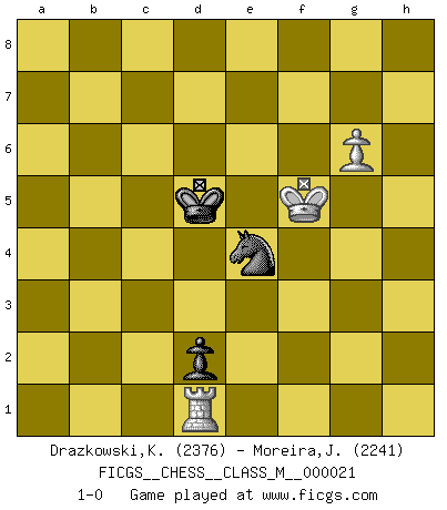 Last move : 1-0 2008 November 1 22:39:15 [Event "FICGS__CHESS__CLASS_M__000021"] [Site "FICGS"] [Date "2008.07.12"] [Round "1"] [White "Drazkowski,Krzysztof"] [Black "Moreira,Jose"] [Result "1-0"] [WhiteElo "2376"] [BlackElo "2241"] 1.d4 Nf6 2.c4 g6 3.Nc3 Bg7 4.e4 d6 5.Be2 O-O 6.Bg5 c5 7.d5 e6 8.Qd2 exd5 9.exd5 Qb6 10.Nf3 Bf5 11.Nh4 Ne4 12.Nxe4 Bxe4 13.f3 h6 14.Bxh6 Bxh6 15.Qxh6 Qxb2 16.O-O Bc2 17.Qd2 Na6 18.Rac1 Qf6 19.Rxc2 Qxh4 20.f4 Rae8 21.Rc3 Qf6 22.Rf2 Qd4 23.Rd3 Qxc4 24.f5 Nb4 25.Rh3 Qd4 26.Qh6 Qg7 27.Qc1 Nxa2 28.Qc4 Rxe2 29.Qxe2 Qa1+ 30.Rf1 Qd4+ 31.Kh1 Nc3 32.Qe1 Ne4 33.Qh4 Re8 34.Qh7+ Kf8 35.Qh8+ Ke7 36.Qxd4 cxd4 37.fxg6 fxg6 38.Rh7+ Kd8 39.Rxb7 Nf6 40.Kg1 Nxd5 41.Rxa7 d3 42.Ra8+ Kd7 43.Rxe8 Kxe8 44.Rd1 Ke7 45.Rxd3 Nf6 46.h4 Ke6 47.Kf2 d5 48.Kf3 Kf5 49.Rd1 Ke5 50.g4 Ne4 51.g5 Nc3 52.Rf1 Ne4 53.Kg4 d4 54.Re1 Kd5 55.h5 gxh5+ 56.Kxh5 d3 57.g6 Nf6+ 58.Kg5 Ne4+ 59.Kf5 d2 60.Rd1 1-0 King's Indian : Averbakh, Main line Kingside Castling by player Black (move 5) Kingside Castling by player White (move 16) 10 pieces endgame at move 43 : White KRRPP , Black KNPPP WHITE : King + 2 Rooks 2 Pawns BLACK : King + 1 Knight 3 Pawns 9 pieces endgame at move 43 : White KRPP , Black KNPPP WHITE : King + 1 Rook 2 Pawns BLACK : King + 1 Knight 3 Pawns 8 pieces endgame at move 45 : White KRPP , Black KNPP WHITE : King + 1 Rook 2 Pawns BLACK : King + 1 Knight 2 Pawns 7 pieces endgame at move 55 : White KRP , Black KNPP WHITE : King + 1 Rook 1 Pawn BLACK : King + 1 Knight 2 Pawns 6 pieces endgame at move 56 : White KRP , Black KNP WHITE : King + 1 Rook 1 Pawn BLACK : King + 1 Knight 1 Pawn Player White won this chess game. Follow this game move after move (download)A player surprised is half beaten. (Proverb) Vom Schach wurde gesagt das Leben sei dafür nicht lange genug. Aber das ist der Fehler des Lebens, nicht des Schach'. (Irving Chernev) Alekhine es un poeta que crea un trabajo de arte de algo que raramente inspiraría a otra persona a mandar una tarjeta postal. (Max Euwe) Nous sommes les pions de la mystérieuse partie d'Echecs jouée par Dieu. Il nous déplace, nous arrête, nous pousse encore, puis nous lance un à un dans la boîte du Néant. Epitaphe sur la tombe de David Janowsky (1868-1927). A computer lets you make more mistakes faster than any invention in human history - with the possible exceptions of handguns and tequila. (Mitch Ratcliffe)