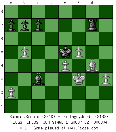 Last move : 0-1 2008 December 4 17:27:7 [Event "FICGS__CHESS__WCH_STAGE_2_GROUP_02__000004"] [Site "FICGS"] [Date "2008.07.12"] [Round "1"] [White "Sammut,Ronald"] [Black "Domingo,Jordi"] [Result "0-1"] [WhiteElo "2210"] [BlackElo "2132"] 1.e4 e5 2.Nf3 f5 3.Bc4 fxe4 4.Nxe5 d5 5.Qh5+ g6 6.Nxg6 hxg6 7.Qxg6+ Kd7 8.Bxd5 Nf6 9.Nc3 Qe7 10.b3 Rh6 11.Qf7 Qxf7 12.Bxf7 Nc6 13.Bb2 Bc5 14.O-O-O Ne5 15.Nd5 Nxd5 16.Bxe5 Kc6 17.d3 Be6 18.Bg7 Rh7 19.Bxe6 Rxg7 20.dxe4 Ba3+ 21.Kd2 Bb4+ 22.Kc1 Nc3 23.g3 Nxd1 24.Rxd1 Bc5 25.Rf1 Rd8 26.h3 Ba3+ 27.Kb1 Rd2 28.Bg4 Bc5 29.f4 Rg2 30.c3 Rxg3 31.b4 Rg1 32.Rxg1 Bxg1 33.Kc2 Bh2 34.f5 Be5 35.Kb3 Kd6 36.Kc4 Bf6 37.Kd3 Ke5 38.Ke3 Bg5+ 39.Kf3 Bd2 40.b5 Bxc3 0-1 Latvian : Polerio variation Queenside Castling by player White (move 14) Player Black won this chess game. Follow this game move after move (download)The sign of a great Master is his ability to win a won game quickly and painlessly. (Irving Chernev) Deine Wertungszahl - vorausgesetzt einige Jahre schachliche Anstrengung - entspricht etwa dem zehnfachen Deines IQ plus 1000. (Jonathan Levitt) Todo lo que importa ante el tablero de Ajedrez son buenas jugadas. (Bobby Fischer) Les échecs sont un jeu par leur forme, un art par leur essence et une science par sa difficulté d'acquisition. Ils peuvent vous procurer autant de plaisir qu'un bon livre ou une belle musique, mais vous n'aurez une réelle joie que si vous arrivez à bien jouer. (Tigran Petrosian) He is a liar. I just don't know what the lie is yet. (Horatio Caine, C.S.I. Miami)