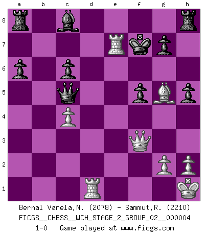 Last move : 1-0 2008 October 21 20:16:9 [Event "FICGS__CHESS__WCH_STAGE_2_GROUP_02__000004"] [Site "FICGS"] [Date "2008.07.12"] [Round "1"] [White "Bernal Varela,Nelson"] [Black "Sammut,Ronald"] [Result "1-0"] [WhiteElo "2078"] [BlackElo "2210"] 1.e4 c5 2.Nf3 d6 3.d4 cxd4 4.Nxd4 Nf6 5.Nc3 a6 6.Bg5 e6 7.f4 Qb6 8.Qd2 Qxb2 9.Rb1 Qa3 10.e5 dxe5 11.fxe5 Nfd7 12.Ne4 h6 13.Bh4 Qxa2 14.Rd1 Nc6 15.Nxc6 bxc6 16.Bd3 Qd5 17.O-O Qxe5 18.Kh1 Be7 19.Bg3 Qd4 20.c3 Qd5 21.c4 Qd4 22.Qe2 h5 23.Bc2 Qa7 24.Nd6+ Bxd6 25.Bxd6 Rh6 26.Qf3 f5 27.Bxf5 exf5 28.Rfe1+ Ne5 29.Bxe5 Kf7 30.Bf4 Rh8 31.Bg5 Qc5 32.Re7+ 1-0 Sicilian : Najdorf, 7...Qb6 Kingside Castling by player White (move 17) Player White won this chess game. Follow this game move after move (download)Chess is above all, a fight ! (Emanuel Lasker) Ein bischen Romantik kann weder im Schach noch in der Liebe schaden. Also versuche ich mich ab und zu daran zu erinnern. (Nigel Short) Alekhine es un poeta que crea un trabajo de arte de algo que raramente inspiraría a otra persona a mandar una tarjeta postal. (Max Euwe) Le génie consiste à savoir transgresser les règles au moment opportun. (Teichmann) The project of the man are lower than those of the sky. (Chinese proverb)