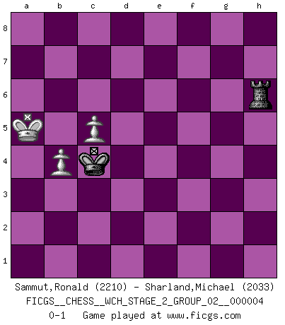 Last move : 0-1 2008 November 3 7:42:36 [Event "FICGS__CHESS__WCH_STAGE_2_GROUP_02__000004"] [Site "FICGS"] [Date "2008.07.12"] [Round "1"] [White "Sammut,Ronald"] [Black "Sharland,Michael"] [Result "0-1"] [WhiteElo "2210"] [BlackElo "2033"] 1.e4 c5 2.Nf3 d6 3.d4 cxd4 4.Nxd4 Nf6 5.Nc3 a6 6.Bg5 e6 7.f4 Nbd7 8.Qf3 Qc7 9.O-O-O b5 10.Bd3 Bb7 11.Rhe1 Be7 12.Qg3 b4 13.Nd5 exd5 14.exd5 Kd8 15.Nc6+ Bxc6 16.dxc6 Nc5 17.Bh4 Rg8 18.Bxh7 Rh8 19.Qxg7 Rxh7 20.Qxf6 Rxh4 21.Qxf7 Rh8 22.Re5 Na4 23.Rd3 Re8 24.Rde3 dxe5 25.Rd3+ Bd6 26.Qg6 Qe7 27.Rxd6+ Kc8 28.Qf5+ Kb8 29.Rd7 Qe6 30.c7+ Kc8 31.Qxe6 Rxe6 32.Rd8+ Kxc7 33.Rxa8 exf4 34.Rf8 Re1+ 35.Kd2 Rg1 36.Rxf4 Rxg2+ 37.Kc1 a5 38.a3 Rg1+ 39.Kd2 Nxb2 40.axb4 a4 41.Kc3 Nd1+ 42.Kd2 a3 43.Rf7+ Kb6 44.c4 a2 45.Rf6+ Kc7 46.Rf7+ Kd6 47.Ra7 Ne3 48.Kxe3 a1Q 49.Rxa1 Rxa1 50.Kd4 Rd1+ 51.Kc3 Rh1 52.c5+ Kd5 53.Kb3 Rxh2 54.Ka4 Kc4 55.Ka5 Rh6 0-1 Sicilian : Najdorf, 7.f4 Queenside Castling by player White (move 9) 10 pieces endgame at move 39 : White KRPPP , Black KRNPP WHITE : King + 1 Rook 3 Pawns BLACK : King + 1 Rook 1 Knight 2 Pawns 9 pieces endgame at move 40 : White KRPPP , Black KRNP WHITE : King + 1 Rook 3 Pawns BLACK : King + 1 Rook 1 Knight 1 Pawn 8 pieces endgame at move 48 : White KRPPP , Black KRP WHITE : King + 1 Rook 3 Pawns BLACK : King + 1 Rook 1 Pawn Promotion Queen by player Black (move 48) 7 pieces endgame at move 49 : White KRPPP , Black KR WHITE : King + 1 Rook 3 Pawns BLACK : King + 1 Rook 6 pieces endgame at move 49 : White KPPP , Black KR WHITE : King + 3 Pawns BLACK : King + 1 Rook 5 pieces endgame at move 53 : White KPP , Black KR WHITE : King + 2 Pawns BLACK : King + 1 Rook Player Black won this chess game. Follow this game move after move (download)As one by one I mowed them down, my superiority soon became apparent. (Jose Capablanca) Es gibt Leute, die glauben, alles wäre vernünftig, was man mit einem ernsthaften Gesicht tut. (Georg Christoph Lichtenberg) Si un gobernante no entiende al Ajedrez, ¿como puede governar él un reinado?. (El Rey Khusros II) Les Cavaliers se révèlent fort utiles dans les positions fermées. D'habitude, les Fous sont un peu plus forts que les Cavaliers dans les positions ouvertes. Qu'on le veuille ou non, il restera toujours des exceptions ! I find television to be very educating. Every time somebody turns on the set, I go in the other room and read a book. (Groucho Marx)