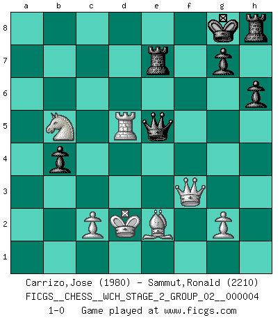 Last move : 1-0 2008 December 14 4:29:1 [Event "FICGS__CHESS__WCH_STAGE_2_GROUP_02__000004"] [Site "FICGS"] [Date "2008.07.12"] [Round "1"] [White "Carrizo,Jose"] [Black "Sammut,Ronald"] [Result "1-0"] [WhiteElo "1980"] [BlackElo "2210"] 1.e4 c5 2.Nf3 d6 3.d4 cxd4 4.Nxd4 Nf6 5.Nc3 a6 6.Bg5 e6 7.f4 Qb6 8.Nb3 Be7 9.Qf3 Nbd7 10.O-O-O Qc7 11.Bd3 b5 12.Rhe1 b4 13.Ne2 Bb7 14.Qh3 Nxe4 15.Bxe7 Kxe7 16.Qh4+ Nef6 17.Ned4 a5 18.Qg5 Kf8 19.Rxe6 h6 20.Qg3 a4 21.Nb5 Qc6 22.Rxd6 axb3 23.Rxc6 bxa2 24.Rxf6 a1Q+ 25.Kd2 Qxb2 26.Rxf7+ Kxf7 27.Qg6+ Kf8 28.Qd6+ Kg8 29.Qe6+ Kf8 30.Qxd7 Qf6 31.Qxb7 Qxf4+ 32.Ke1 Re8+ 33.Be2 Qxh2 34.Qf3+ Kg8 35.Rd7 Qe5 36.Kd2 Re7 37.Rd5 1-0 Sicilian : Najdorf, 7...Qb6 Queenside Castling by player White (move 10) Promotion Queen by player Black (move 24) Player White won this chess game. Follow this game move after move (download)Why must I lose to this idiot ? (Aron Nimzovich) Der Vorposten provoziert a) eine Basis für neue Angriffe und b) eine Schwächung der gegnerischen Widerstandskraft in der fraglichen Linie. (Aaron Nimzowitsch) El jugador táctico debe saber que hacer cuando algo se debe de hacer. El estratégico debe saber que hacer cuando nada se debe de hacer. (Savielly Tartakover) Un footballeur joue avec ses pieds, parfois avec sa tête. Un joueur d'échecs ne joue qu'avec sa tête. Et quand il ne joue plus, il meurt. (Jacob Murray) Locking firmely the window serves nothing, only small thiefs pass through there, the big thiefs enter through the front door. (Luc-Olivier Leclerc)