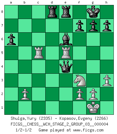 Last move : 1/2-1/2 2008 September 30 12:46:33 [Event "FICGS__CHESS__WCH_STAGE_2_GROUP_03__000004"] [Site "FICGS"] [Date "2008.07.12"] [Round "1"] [White "Shulga,Yury"] [Black "Kopasov,Evgeny"] [Result "1/2-1/2"] [WhiteElo "2335"] [BlackElo "2266"] 1.d4 d5 2.c4 dxc4 3.Nf3 Nf6 4.e3 e6 5.Bxc4 c5 6.O-O a6 7.a4 Nc6 8.Qe2 Qc7 9.Nc3 Bd6 10.Rd1 O-O 11.h3 b6 12.d5 exd5 13.Nxd5 Nxd5 14.Bxd5 Bb7 15.e4 Rae8 16.Be3 Bc8 17.Qd2 Rd8 18.Qc3 Rfe8 19.Rac1 Be6 20.Bxc6 Qxc6 21.a5 bxa5 22.Qxa5 Be7 23.Re1 Qxe4 24.Bxc5 Qd5 25.Re5 Qc6 26.Qe1 Bxc5 27.R1xc5 Qa8 28.Qe4 Qxe4 1/2-1/2 QGA : Classical, Rubinstein variation Kingside Castling by player White (move 6) Kingside Castling by player Black (move 10) This chess game ended in a draw. Follow this game move after move (download)We like to think. (Gary Kasparov) Auf Remis zu spielen ist gewissermaßen ein Verbrechen gegen das Schachspiel. (Mikhail Nekhemyevich Tal) Aquel que ve no otra dirección en el juego que la de dar Jaque Mate a su oponente, nunca será un buen jugador de Ajedrez. (Euwe) Horreur, mais aussi harmonie suprême : qu'y avait-il en effet au monde en dehors des échecs ? Le brouillard, l'inconnu, le non-être... (Vladimir Nabokov) Fame, I have already. Now I need the money. (an elderly Steinitz)