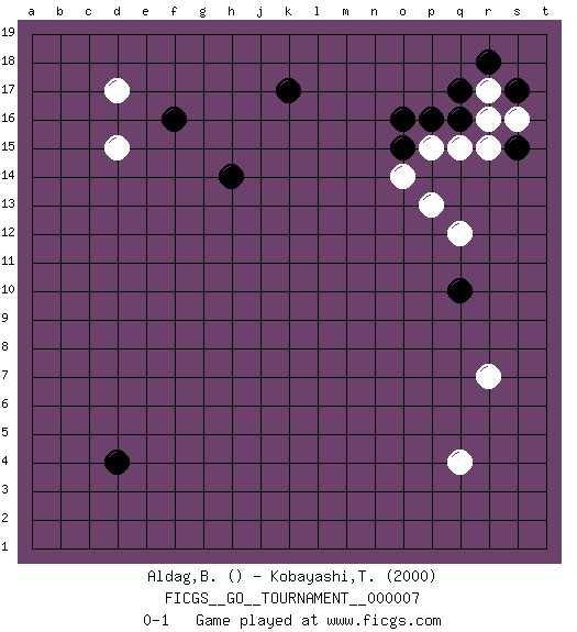 Last move : 0-1 2006 October 31 7:55:48 [Event "FICGS__GO__TOURNAMENT__000007"] [Site "FICGS"] [Date "2006.07.27"] [Round "1"] [Black "Aldag,Benjamin"] [White "Kobayashi,Tetsuya"] [Result "0-1"] [Rating 2 "2000"] 1.p16 q4 2.d4 d17 3.f16 d15 4.k17 r17 5.q10 q15 6.h14 p15 7.o16 r7 8.o15 q12 9.q16 r16 10.q17 p13 11.r18 r15 12.s17 o14 13.s15 s16 0-1 This go game has been lost on time (started : 2006.07.27 16:39:34) Here are the names of the openings (joseki) played in the four corners : Corner d16 : d17 f16 Komoku (Somok, Xiao~mu`) 3-4 Point. The komoku (3-4) point is the traditional corner enclosure move.. Corner q16 : p16 r17 Takamoku (Gomok, Gaomu`) 5-4 Point. The takamoku (high) point (5-4). With its emphasis on influence, the 5-4 point complements the 4-4 (hoshi) point in creating an influence-oriented fuseki. San-san. White plays the 3-3 when Black has a stone at top such as marked. Player White won this Go (weiqi, baduk) game. Follow this game move after move (download)... {it is} something unearthly... if there are sentient beings on other planets, then they play go. (Emanuel Lasker, chess world champion) I feel so... helpless. (C-3PO in Star Wars ep.3)