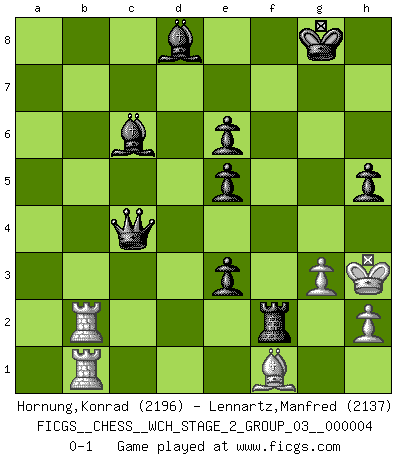 Last move : 0-1 2008 October 27 20:53:41 [Event "FICGS__CHESS__WCH_STAGE_2_GROUP_03__000004"] [Site "FICGS"] [Date "2008.07.12"] [Round "1"] [White "Hornung,Konrad"] [Black "Lennartz,Manfred"] [Result "0-1"] [WhiteElo "2196"] [BlackElo "2137"] 1.e4 c5 2.Nf3 d6 3.d4 cxd4 4.Nxd4 Nf6 5.Nc3 a6 6.Bg5 e6 7.f4 Qb6 8.Qd2 Qxb2 9.Rb1 Qa3 10.f5 Nc6 11.fxe6 fxe6 12.Nxc6 bxc6 13.e5 dxe5 14.Bxf6 gxf6 15.Ne4 Be7 16.Be2 h5 17.Rf1 f5 18.Rf3 Qxa2 19.Rfb3 fxe4 20.Qc3 Bh4+ 21.g3 Bd8 22.Qxc6+ Bd7 23.Qxa8 Qxc2 24.R3b2 Qc3+ 25.Kf1 O-O 26.Kg2 e3 27.Qxa6 Bc6+ 28.Kh3 Rf2 29.Bf1 Qd4 30.Qc4 Qxc4 0-1 Sicilian : Najdorf, 7...Qb6 Kingside Castling by player Black (move 25) Player Black won this chess game. Follow this game move after move (download)No one ever won a game by resigning. (Unknown) Ich hatte meine größten Erfolge, als ich 47 Jahre alt war. Kasparow war noch nicht mal 42 und hat das Schach schon im Stich gelassen. (Viktor Kortschnoi) Los asuntos humanos son como una partida de Ajedrez: solo aquellos que no lo toman seriamente, pueden ser llamados buenos jugadores. (Hung Tzu Ch'eng) Ce qui caractérise les parties de combat, c'est que si le défenseur a constamment de difficiles problèmes à résoudre, l'attaquant doit chercher sans relâche de nouvelles possibilités d'attaque. (Koblentz) True nature is revealed in times of difficulty. (Chinese proverb)
