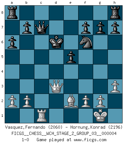 Last move : 1-0 2008 September 18 14:31:14 [Event "FICGS__CHESS__WCH_STAGE_2_GROUP_03__000004"] [Site "FICGS"] [Date "2008.07.12"] [Round "1"] [White "Vasquez,Fernando"] [Black "Hornung,Konrad"] [Result "1-0"] [WhiteElo "2060"] [BlackElo "2196"] 1.e4 c5 2.d4 cxd4 3.c3 dxc3 4.Nxc3 Nc6 5.Nf3 d6 6.Bc4 a6 7.O-O Nf6 8.Bf4 Bg4 9.h3 Bxf3 10.Qxf3 e6 11.Rfd1 Qb8 12.Be2 Be7 13.Qg3 e5 14.Nd5 Kf8 15.Be3 Nxe4 16.Qf3 Nf6 17.Nb6 Ra7 18.Rac1 Qe8 19.Nc4 Ra8 20.Nxd6 Qb8 21.Bc5 Nd4 22.Bxd4 Bxd6 23.Bb6 Ke7 24.Rxd6 Kxd6 25.Bc7+ Qxc7 26.Qd3+ 1-0 Sicilian : Smith-Morra gambit Kingside Castling by player White (move 7) Player White won this chess game. Follow this game move after move (download)The way he plays Chess demonstrates a man's whole nature. (Stanley Ellin) In der Schule lernt man nichts. Es ist nur Zeitverschwendung. (Robert James Fischer) Vive, pierde y aprende al observar a tu oponente como ganar. (Amber Steenbock) On n'a jamais que l'âge auquel on a commence à jouer aux échecs car après on cesse de vieillir. (Capablanca) The Internet is the world's largest library. It's just that all the books are on the floor. (John Allen Paulos)