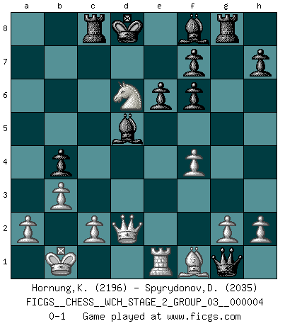 Last move : 0-1 2008 November 5 19:44:17 [Event "FICGS__CHESS__WCH_STAGE_2_GROUP_03__000004"] [Site "FICGS"] [Date "2008.07.12"] [Round "1"] [White "Hornung,Konrad"] [Black "Spyrydonov,Dmitry"] [Result "0-1"] [WhiteElo "2196"] [BlackElo "2035"] 1.e4 c5 2.Nf3 d6 3.d4 cxd4 4.Nxd4 Nf6 5.Nc3 a6 6.Bg5 e6 7.f4 Nbd7 8.Qf3 Qc7 9.O-O-O b5 10.Bxf6 Nxf6 11.e5 Bb7 12.Qe3 b4 13.Ncb5 axb5 14.Nxb5 Qc6 15.exf6 gxf6 16.Kb1 Ra5 17.Nd4 Qc5 18.Qd2 Ra8 19.Nb5 Bd5 20.b3 Rg8 21.Re1 Rc8 22.Rg1 Qxg1 23.Nxd6+ Kd8 0-1 Sicilian : Najdorf, 7.f4 Queenside Castling by player White (move 9) Player Black won this chess game. Follow this game move after move (download)There's never before been a Chess player with such a thorough knowledge of the intricacies of the game and such an absolutely indomitable will to win. I think Bobby is the greatest player that ever lived. (Lisa Lane) Obendrein hat der FIDE-Präsident den Revolutionsführer Gaddafi zum »Großmeister« ernannt, am Ende der WM. Das ist lächerlich! (Joel Lautier) Un juego de Ajedrez es un dialogo, una conversación entre un jugador y su oponente. Cada movimiento del oponente puede contener amenazas o tropiezos, pero un jugador no se puede defender de las amenazas o tomar ventaja de los tropiezos si es que no se pregunta a sí mismo: ¿Que es lo que mi oponente va a hacer después de cada movida?. (Bruce A. Moon) Il (Jacob Murray) ne joue pas pour le bon coup, mais pour le meilleur. (Eloi Relange) Two beer, or not two beer. (Unknown)