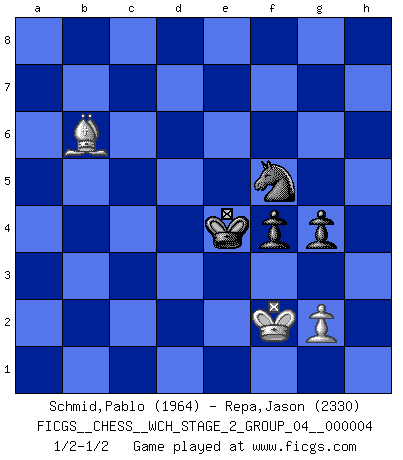 Last move : 1/2-1/2 2009 January 19 22:18:51 [Event "FICGS__CHESS__WCH_STAGE_2_GROUP_04__000004"] [Site "FICGS"] [Date "2008.07.12"] [Round "1"] [White "Schmid,Pablo"] [Black "Repa,Jason"] [Result "1/2-1/2"] [WhiteElo "1964"] [BlackElo "2330"] 1.d4 e6 2.e4 d5 3.Nc3 Nf6 4.Bg5 Bb4 5.e5 h6 6.Be3 Ne4 7.Qg4 Kf8 8.a3 Bxc3+ 9.bxc3 c5 10.Bd3 Nxc3 11.dxc5 Nc6 12.Nf3 f5 13.Qh5 Qe8 14.Qh3 Kg8 15.O-O Bd7 16.Rfe1 Qf7 17.a4 Rc8 18.a5 a6 19.Ra3 Ne4 20.Rb1 Rc7 21.c3 Ng5 22.Qg3 Nxf3+ 23.Qxf3 Nxe5 24.Qf4 Nxd3 25.Qxc7 f4 26.Bd4 Bb5 27.Be5 Qxc7 28.Bxc7 Kh7 29.Bd6 Rc8 30.Rxb5 axb5 31.Rb3 Nxc5 32.Rxb5 Nd3 33.Rxb7 d4 34.Rc7 Rxc7 35.Bxc7 dxc3 36.Bd6 c2 37.Ba3 Nc5 38.f3 Kg6 39.Kf1 Kf5 40.Ke2 g5 41.h3 h5 42.Kd2 Nb3+ 43.Kxc2 Nxa5 44.Kd3 e5 45.Bc5 Nc6 46.Bd6 Nd8 47.Bc5 Ne6 48.Bb6 Nf8 49.Bc5 Nd7 50.Ba7 g4 51.hxg4+ hxg4 52.Bg1 Nf6 53.Ba7 e4+ 54.fxe4+ Nxe4 55.Ke2 Nf6 56.Kf2 Ke4 57.Ke2 Ne8 58.Bb8 Ng7 59.Ba7 Nf5 60.Bb6 Ng3+ 61.Kf2 Nf5 1/2-1/2 Queen's pawn Kingside Castling by player White (move 15) 10 pieces endgame at move 51 : White KBPPP , Black KNPPP WHITE : King + 1 Bishop 3 Pawns BLACK : King + 1 Knight 3 Pawns 9 pieces endgame at move 51 : White KBPP , Black KNPPP WHITE : King + 1 Bishop 2 Pawns BLACK : King + 1 Knight 3 Pawns 8 pieces endgame at move 54 : White KBPP , Black KNPP WHITE : King + 1 Bishop 2 Pawns BLACK : King + 1 Knight 2 Pawns 7 pieces endgame at move 54 : White KBP , Black KNPP WHITE : King + 1 Bishop 1 Pawn BLACK : King + 1 Knight 2 Pawns This chess game ended in a draw. Follow this game move after move (download)Chess is a fighting game which is purely intellectual and includes chance. (Richard Reti) Alles was ich jemals tun will ist Schach spielen. (Robert James Fischer) A través de las casillas del tablero, los Indios explican el movimiento del tiempo y la edad, las influencias mas altas que controlan el mundo y los lazos que vinculan al Ajedrez con el alma humana. (Al-Masudi) La solitude du joueur d'Echecs à l'approche du mat est semblable à celle du condamné. (Francis Szpiner) When you've done things right people won't know you've done anything at all. (Futurama)