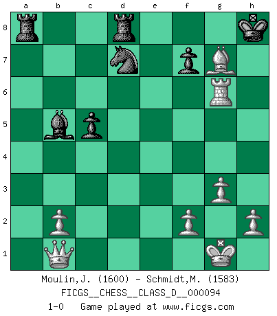 Last move : 1-0 2008 December 23 11:59:38 [Event "FICGS__CHESS__CLASS_D__000094"] [Site "FICGS"] [Date "2008.07.13"] [Round "1"] [White "Moulin,Jean-Fred"] [Black "Schmidt,Michael Wilhelm"] [Result "1-0"] [WhiteElo "1600"] [BlackElo "1583"] 1.d4 Nf6 2.c4 c5 3.d5 b5 4.cxb5 a6 5.bxa6 Bxa6 6.Nc3 d6 7.Nf3 g6 8.g3 Bg7 9.Bg2 Nbd7 10.Rb1 O-O 11.O-O Qa5 12.Bf4 Nh5 13.Bd2 Bxc3 14.Bxc3 Qxa2 15.Re1 Nhf6 16.e4 Qc4 17.Bf1 Qa2 18.Ra1 Qxa1 19.Qxa1 Bxf1 20.Qb1 Bb5 21.Ng5 h6 22.Nf3 Ng4 23.e5 dxe5 24.Nxe5 Ngxe5 25.Bxe5 Bc4 26.Bf4 Bxd5 27.Rxe7 Bc6 28.Bxh6 Rfd8 29.Re6 Bb5 30.Rxg6+ Kh8 31.Bg7+ 1-0 Benko gambit accepted Kingside Castling by player Black (move 10) Kingside Castling by player White (move 11) Player White won this chess game. Follow this game move after move (download)All my games are real. (Bobby Fischer) Heutzutage gewinnt im Turnier nicht derjenige Spieler, der weitreichende Pläne entwirft, sondern einfach jener, der Zug um Zug kämpft. (David Bronstein) Fischer es una tragedia del Ajedrez Americano a la par con Morphy y Pillsbury. (Mig Greengard) Les échecs, c'est l'art d'analyser. (Mikhail Botvinnik) Every man's memory is his private literature. (Aldous Huxley)