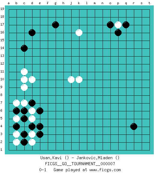 Last move : 0-1 2006 October 16 18:23:49 [Event "FICGS__GO__TOURNAMENT__000007"] [Site "FICGS"] [Date "2006.07.27"] [Round "1"] [Black "Usan,Kavi"] [White "Jankovic,Mladen"] [Result "0-1"] 1.r4 k16 2.q17 c11 3.d16 c4 4.e4 k10 5.c5 c10 6.c14 p17 7.p16 c9 8.d4 d10 9.g17 j10 10.o17 d5 11.c6 c7 12.b4 b5 13.b6 b7 14.c3 d3 15.e3 d2 16.e6 d6 17.d7 b3 18.c2 b2 0-1 This go game has been lost on time (started : 2006.07.27 16:39:34) Here are the names of the openings (joseki) played in the four corners : Corner d16 : c11 d16 This joseki is unknown. A weak or weird move has probably been played in this corner. Corner d4 : c4 e4 Komoku (Somok, Xiao~mu`) 3-4 Point. The komoku (3-4) point is the traditional corner enclosure move.. Ikken Takagakari (Hankan Nop'dakeolch'im, Yi Gaogua`jiao~, 1-Space High Approach). The 5-4 approach move has become more popular in modern times, as modern Go emphasizes speed and influence. Corner q16 : q17 p17 Komoku (Somok, Xiao~mu`) 3-4 Point. The komoku (3-4) point is the traditional corner enclosure move.. Player White won this Go (weiqi, baduk) game. Follow this game move after move (download)Don't get surrounded ! Ever ! (Anonymous) I know the human being and fish can coexist peacefully. (George W. Bush, Saginaw sept. 29, 2000)
