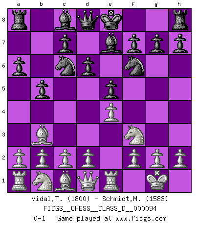 Last move : 0-1 2008 September 2 20:36:39 [Event "FICGS__CHESS__CLASS_D__000094"] [Site "FICGS"] [Date "2008.07.13"] [Round "1"] [White "Vidal,Tomas"] [Black "Schmidt,Michael Wilhelm"] [Result "0-1"] [WhiteElo "1800"] [BlackElo "1583"] 1.e4 e5 2.Nf3 Nc6 3.Bb5 a6 4.Ba4 Nf6 5.O-O Be7 6.Re1 b5 7.Bb3 d6 0-1 This chess game has been lost on time (started : 2008.07.13 20:2:19) Ruy Lopez : Closed Kingside Castling by player White (move 5) Player Black won this chess game. Follow this game move after move (download)Even the laziest King flees wildly in the face of a double check ! (Aaron Nimzowitsch) Ein unbeabsichtigtes Patt ist der Gipfel der Dummheit. (Anonymous) El poder defensivo de una pieza clavada, solamente es imaginario. (Aaron Nimzovich) Les Echecs, c'est l'art de la guerre sans les charniers, c'est la résurrection des morts tombés au champ d'honneur, l'espoir perpétuel, la suprématie de l'intelligence sur la force, la culture de l'esprit. (F. Szpiner) Fame, I have already. Now I need the money. (an elderly Steinitz)