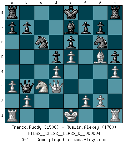 Last move : 0-1 2008 October 19 12:17:45 [Event "FICGS__CHESS__CLASS_D__000094"] [Site "FICGS"] [Date "2008.07.13"] [Round "1"] [White "Franco,Ruddy"] [Black "Ruslin,Alexey"] [Result "0-1"] [WhiteElo "1500"] [BlackElo "1700"] 1.e4 c6 2.d4 d5 3.e5 Bf5 4.h4 h6 5.Nd2 e6 6.Ne2 c5 7.c3 cxd4 8.cxd4 Nc6 9.a3 Nge7 10.Nb3 h5 11.Bg5 Qb6 12.Ng3 Bg6 13.Bd3 Bxd3 14.Qxd3 Ng6 15.Ne2 Be7 16.Nc3 Qxb3 0-1 Caro-Kann : Advance variation Player Black won this chess game. Follow this game move after move (download)Chess is the art which expresses the science of logic. (Mikhail Botvinnik) Im Leben werden Partien nie so unstrittig gewonnen wie im Spiel (Emanuel Lasker) Por la belleza de sus partidas, la claridad de su juego y lo brillante de sus ideas, Fischer se creó el mismo como un artista de la misma estatura como Brahms, Rembrandt y Shakespeare. (David Levy) J'ai vu le vaincu d'Echecs jouer des années durant dans l'espoir de la fête de la victoire. Car tu es plus riche de ce qu'elle existe si même elle n'est point pour toi. Ainsi de la perle du fond des mers. (Antoine de Saint-Exupéry) When you stop learning you start dying. (M. Scott Adams)