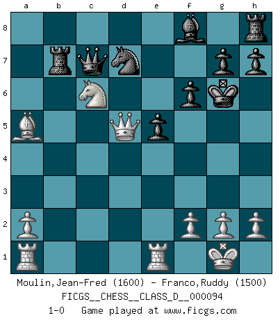 Last move : 1-0 2008 November 17 21:19:50 [Event "FICGS__CHESS__CLASS_D__000094"] [Site "FICGS"] [Date "2008.07.13"] [Round "1"] [White "Moulin,Jean-Fred"] [Black "Franco,Ruddy"] [Result "1-0"] [WhiteElo "1600"] [BlackElo "1500"] 1.d4 d5 2.c4 e6 3.Nf3 Nf6 4.Nc3 c6 5.e3 Nbd7 6.Bd3 dxc4 7.Bxc4 b5 8.Bd3 a6 9.e4 c5 10.e5 cxd4 11.Nxb5 Nxe5 12.Nxe5 axb5 13.Bxb5+ Bd7 14.Bxd7+ Nxd7 15.Nf3 e5 16.O-O f6 17.Bd2 Rb8 18.Re1 Rxb2 19.Nxd4 Kf7 20.Bc3 Rb7 21.Nc6 Qc7 22.Qd5+ Kg6 23.Ba5 1-0 Queen's gambit declined Kingside Castling by player White (move 16) Player White won this chess game. Follow this game move after move (download)Chess is ruthless: you've got to be prepared to kill people. (Nigel Short) Der beste Spieler in einem Turnier gewinnt es nie. Er landet auf Platz zwei oder drei. (Siegbert Tarrasch) El Ajedrez, como cualquier actividad creativa, solo puede existir a través del esfuerzo combinado de aquellos que tienen talento creativo y de aquellos que poseen la habilidad de organizar su trabajo creativo. (Mikhail Botvinnik) Même si vous avez un bon coup à faire, regardez toujours s'il n'y en a pas un qui lui soit préférable. (Pedro Damiano) History is the quarrels of popes and kings, with wars or pestilences in every page; the men all so good for nothing, and hardly any women at all. (Jane Austen)