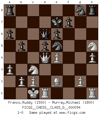 Last move : 1-0 2008 October 10 23:16:54 [Event "FICGS__CHESS__CLASS_D__000094"] [Site "FICGS"] [Date "2008.07.13"] [Round "1"] [White "Franco,Ruddy"] [Black "Murray,Michael"] [Result "1-0"] [WhiteElo "1500"] [BlackElo "1800"] 1.e4 c6 2.d4 d5 3.e5 Bf5 4.h4 h5 5.Ne2 e6 6.a3 c5 7.Nbc3 Nc6 8.Be3 cxd4 9.Nxd4 Bc5 10.Nxf5 Bxe3 11.Nxg7+ Ke7 12.fxe3 Nxe5 13.Nxh5 Qb6 14.Qd4 Qd6 15.Be2 a6 16.O-O-O b5 17.e4 1-0 This chess game has been lost on time (started : 2008.07.13 20:2:19) Caro-Kann : Advance variation Queenside Castling by player White (move 16) Player White won this chess game. Follow this game move after move (download)Capture of the adverse King is the ultimate but not the first object of the game. (William Steinitz) Schach ist ein schwarz-weisser Dschungel. (Garry Kasparov) El ganador de una partida es aquel jugador que hace el penúltimo error. (Savielly Tartakover) Il a essayé de se convaincre qu'il pourrait empêcher toutes les erreurs et ne jamais perdre. L'horreur ! Gary Kasparov au sujet de Robert Fischer. Difficult things take a long time, impossible things a little longer. (Author unknown)