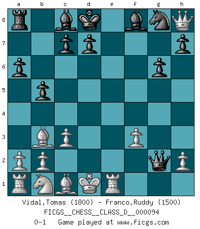 Last move : 0-1 2008 September 24 22:25:17 [Event "FICGS__CHESS__CLASS_D__000094"] [Site "FICGS"] [Date "2008.07.13"] [Round "1"] [White "Vidal,Tomas"] [Black "Franco,Ruddy"] [Result "0-1"] [WhiteElo "1800"] [BlackElo "1500"] 1.e4 e5 2.Nf3 Nc6 3.Bb5 a6 4.Ba4 b5 5.Bb3 Nd4 6.c3 Nc6 7.d4 f6 8.dxe5 Nxe5 9.Nxe5 fxe5 10.Qh5+ g6 11.Qxe5+ Qe7 12.Qxh8 Qxe4+ 13.Kd1 Qg4+ 14.f3 Qxg2 15.Re1+ Kd8 0-1 Ruy Lopez : Caro variation Player Black won this chess game. Follow this game move after move (download)Chess mastery essentially consists of analyzing Chess positions accurately. (Mikhail Botvinnik) Ich war zu klein für die Schach-Schülermannschaft! (Woody Allen) Sin errores no puede haber brillantez. (Emanuel Lasker) Pour se monter efficace, un Cavalier a besoin d'avant-postes ! Les Cavaliers font les meilleurs bloqueurs de pions passés. The arrogant army will lose certainly the battle. (Chinese proverb)