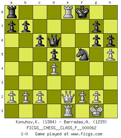 Last move : 1-0 2008 September 2 21:34:14 [Event "FICGS__CHESS__CLASS_F__000062"] [Site "FICGS"] [Date "2008.07.15"] [Round "1"] [White "Konuhov,Konstantin"] [Black "Barradas,Anderson"] [Result "1-0"] [WhiteElo "1384"] [BlackElo "1239"] 1.e4 e5 2.Nf3 Nf6 3.Nxe5 d6 4.Nf3 Nxe4 5.d4 d5 6.Bd3 Bf5 7.O-O Nc6 8.Nbd2 Nxd2 9.Qxd2 Bxd3 10.Qxd3 Bd6 11.Re1+ Be7 12.Bg5 O-O 13.Bxe7 Nxe7 14.h4 c6 15.h5 h6 16.Re3 Re8 17.Rae1 Qd6 18.Qe2 Kf8 19.Ne5 Nf5 20.Ng6+ fxg6 21.Rxe8+ 1-0 Petrov : Classical attack Kingside Castling by player White (move 7) Kingside Castling by player Black (move 12) Player White won this chess game. Follow this game move after move (download)At this time Fischer is simply a level above all the best Chessplayers in the world. (John Jacobs) Dass jemand wie Surab Asmaiparaschwili, der selbst Elopunkte gekauft hat , Vize-Präsident der Fide werden konnte, sagt schon einges über den Zustand dieser Organisation aus. (Joel Lautier) Cuando la partida de Ajedrez termina, el Peón y el Rey regresan a la misma caja. (Irish saying) Le système Elo représente seulement une moyenne. Il est simplement un indicateur de votre stabilité. (Anatoli Karpov) When you stop learning you start dying. (Scott Adams)