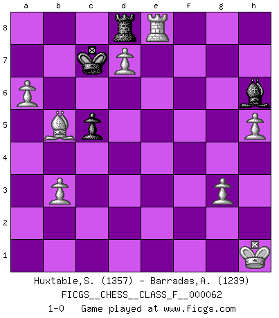Last move : 1-0 2008 September 8 20:42:26 [Event "FICGS__CHESS__CLASS_F__000062"] [Site "FICGS"] [Date "2008.07.15"] [Round "1"] [White "Huxtable,Simon"] [Black "Barradas,Anderson"] [Result "1-0"] [WhiteElo "1357"] [BlackElo "1239"] 1.d4 Nf6 2.c4 e6 3.Nc3 Bb4 4.Qc2 O-O 5.Bg5 d6 6.e4 e5 7.dxe5 dxe5 8.Rd1 Bd7 9.Bd3 Nc6 10.Nf3 Bg4 11.Be2 Qe7 12.O-O h6 13.Bh4 g5 14.Bg3 Bxf3 15.Bxf3 Nd4 16.Qd3 a6 17.Kh1 Rad8 18.Nd5 Qd6 19.Bxe5 Qxe5 20.Qxd4 Qxd4 21.Rxd4 Nxd5 22.cxd5 c5 23.R4d1 f5 24.e5 g4 25.Be2 h5 26.a3 Ba5 27.a4 Rfe8 28.e6 Rd6 29.Bc4 Kf8 30.f3 Ke7 31.fxg4 fxg4 32.Rf7+ Kd8 33.Rdf1 Re7 34.Rf8+ Kc7 35.R1f7 Rxf7 36.Rxf7+ Kd8 37.e7+ Ke8 38.Rh7 Rb6 39.b3 Rd6 40.Rxh5 Kxe7 41.Rh7+ Kd8 42.Rxb7 Rf6 43.Bxa6 Rf4 44.g3 Rf6 45.Bc4 Kc8 46.Rg7 Rh6 47.Rxg4 Kc7 48.Re4 Rh7 49.Re6 Kb8 50.d6 Rd7 51.Bb5 Rd8 52.d7 Kb7 53.Re8 Kb8 54.h4 Kc7 55.h5 Bd2 56.Re2 Bh6 57.a5 Rb8 58.Re8 Rd8 59.a6 1-0 Nimzo-Indian : Classical variation Kingside Castling by player Black (move 4) Kingside Castling by player White (move 12) Player White won this chess game. Follow this game move after move (download)No price is too great for the scalp of the enemy King. (Koblentz) Schach wird sich dank seiner hohen kulturellen Tradition immer durchsetzen. In näherer Zukunft womöglich sogar als Gegenreaktion auf die maßlose Reizüberflutung im Freizeit- und Spielbereich. (Garry Kasparov) En el Ajedrez, tal como en la vida, las bendiciones de hoy pueden ser el veneno del mañana. (Assaic) Vouloir jouer aux échecs contre soi-même est aussi paradoxal que vouloir marcher sur son ombre. (Stefan Zweig) Follow your passion, and success will follow you. (Arthur Buddhold)