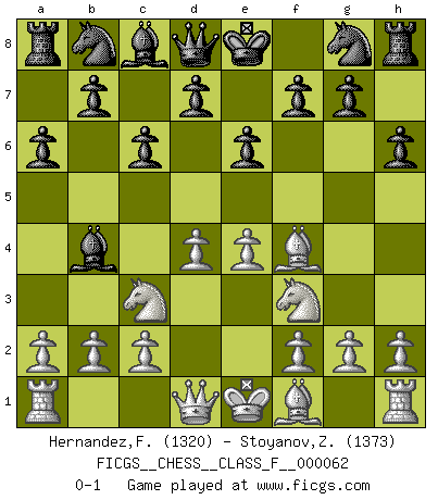 Last move : 0-1 2008 September 4 20:43:51 [Event "FICGS__CHESS__CLASS_F__000062"] [Site "FICGS"] [Date "2008.07.24"] [Round "1"] [White "Hernandez,Francisco"] [Black "Stoyanov,Zdravko"] [Result "0-1"] [WhiteElo "1320"] [BlackElo "1373"] 1.d4 c6 2.e4 e6 3.Nc3 a6 4.Nf3 h6 5.Bf4 Bb4 0-1 This chess game has been lost on time (started : 2008.07.24 0:18:10) Queen's pawn Player Black won this chess game. Follow this game move after move (download)On the chessboard, lies and hypocrisy do not survive long. (Emanuel Lasker) Spielt Blackmar-Diemer-Gambit, und das Matt kommt von selbst! (Emil Joseph Diemer) No solamente yo pronostico su triunfo sobre Botvinnik, sino que me adelanto y digo que probablemente Fischer es el jugador de Ajedrez mas grande que haya existido. (John Collins) À la honte des hommes, on sait que les lois du jeu sont les seules qui soient partout justes, claires, inviolables et exécutées. Pourquoi l'Indien qui a donné les règles du jeu d'échecs est-il obéi de bon gré dans toute la terre, et que les décrétales des papes, par exemple, sont aujourd'hui un objet d'horreur et de mépris ? C'est que l'inventeur des échecs combina tout avec justesse pour la satisfaction des joueurs, et que les papes, dans leurs décrétales, n'eurent en vue que leur seul avantage. L'Indien voulut exercer également l'esprit des hommes et leur donner du plaisir; les papes ont voulu abrutir l'esprit des hommes. Voltaire (Dictionnaire philosophique / Garnier 1967) Drag your thoughts away from your troubles... by the ears, by the heels, or any other way you can manage it. (Mark Twain)