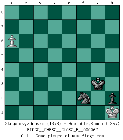 Last move : 0-1 2008 August 6 20:4:46 [Event "FICGS__CHESS__CLASS_F__000062"] [Site "FICGS"] [Date "2008.07.24"] [Round "1"] [White "Stoyanov,Zdravko"] [Black "Huxtable,Simon"] [Result "0-1"] [WhiteElo "1373"] [BlackElo "1357"] 1.e4 c6 2.Nf3 d5 3.e5 Bg4 4.Be2 Nd7 5.d4 c5 6.h3 Bh5 7.Nc3 e6 8.Ng5 Bxe2 9.Nxe2 h6 10.Nf3 Qb6 11.c3 cxd4 12.Qxd4 Qxd4 13.Nexd4 Bc5 14.Be3 Ne7 15.a3 Ng6 16.Nb3 Bxe3 17.fxe3 Ndxe5 18.Nxe5 Nxe5 19.O-O Nc4 20.Nc5 b6 21.Na6 Rc8 22.Rf3 Nxb2 23.Rc1 Na4 24.Nb4 Rxc3 25.Rxc3 Nxc3 26.Nc6 a6 27.Ne5 f6 28.Ng6 Rg8 29.Rf1 Kf7 30.Nf4 g5 31.Nd3 Rc8 32.Ne5+ Kg7 33.Nd7 f5 34.Nxb6 Rb8 35.Nd7 Rb3 36.Nc5 Rb6 37.Nd7 Rd6 38.Nc5 Kf6 39.Kh2 d4 40.exd4 Rxd4 41.Rc1 Nd5 42.Ra1 a5 43.Nb3 Ra4 44.Nc5 Rc4 45.Nd7+ Kg6 46.Ne5+ Kf6 47.Nxc4 e5 48.Nxa5 e4 49.Rd1 Ke6 50.Nc4 e3 51.Re1 f4 52.a4 Nc7 53.a5 Na6 54.g3 Kd5 55.Nb2 Ke4 56.gxf4 gxf4 57.Nd1 Kd3 58.Rh1 e2 59.Nf2+ Kd2 60.Ne4+ Ke3 61.Ng3 f3 62.Nxe2 fxe2 63.Kg3 h5 64.h4 Nc5 65.Re1 Ne4+ 66.Kh3 Nc5 67.Rxe2+ Kxe2 68.Kg2 Ke3 69.Kg3 Na6 70.Kh3 Kf4 71.Kg2 Kg4 72.Kh2 Kxh4 73.Kg2 Kg4 74.Kh2 h4 75.Kg2 h3+ 76.Kg1 Kg3 77.Kh1 Nc5 78.Kg1 h2+ 79.Kh1 Nd3 80.a6 Nf2+ 0-1 Caro-Kann defense Kingside Castling by player White (move 19) 10 pieces endgame at move 56 : White KRNPP , Black KNPPP WHITE : King + 1 Rook 1 Knight 2 Pawns BLACK : King + 1 Knight 3 Pawns 9 pieces endgame at move 62 : White KRNPP , Black KNPP WHITE : King + 1 Rook 1 Knight 2 Pawns BLACK : King + 1 Knight 2 Pawns 8 pieces endgame at move 62 : White KRPP , Black KNPP WHITE : King + 1 Rook 2 Pawns BLACK : King + 1 Knight 2 Pawns 7 pieces endgame at move 67 : White KRPP , Black KNP WHITE : King + 1 Rook 2 Pawns BLACK : King + 1 Knight 1 Pawn 6 pieces endgame at move 67 : White KPP , Black KNP WHITE : King + 2 Pawns BLACK : King + 1 Knight 1 Pawn 5 pieces endgame at move 72 : White KP , Black KNP WHITE : King + 1 Pawn BLACK : King + 1 Knight 1 Pawn Player Black won this chess game. Follow this game move after move (download)Look at Garry Kasparov. After he loses, invariably he wins the next game. He just kills the next guy. That's something that we have to learn to be able to do. (Maurice Ashley) Im Fernschach kannst du während dem Spiel rauchen. (John Christen Knudsen) Bobby solo arroja las piezas y solas caen en las casillas correctas. (Miguel Najdorf ) Si le désir cupide (et stupide) de gagner est une inépuisable source de souffrance, une combinaison brillante sur l'échiquier est une découverte : le coquelicot qui s'épanouit lorsque apparaît la Voie Lactée. (Arrabal) Hold em is to stud what chess is to checkers. (Johnny Moss)