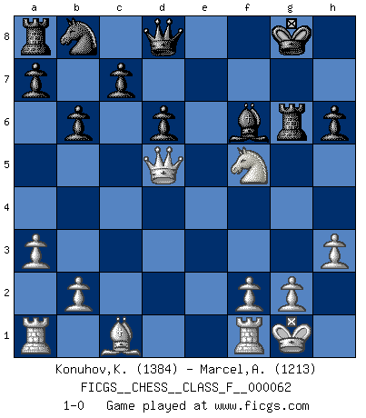 Last move : 1-0 2008 August 28 11:35:56 [Event "FICGS__CHESS__CLASS_F__000062"] [Site "FICGS"] [Date "2008.07.15"] [Round "1"] [White "Konuhov,Konstantin"] [Black "Marcel,Alexis"] [Result "1-0"] [WhiteElo "1384"] [BlackElo "1213"] 1.d4 f5 2.c4 Nf6 3.Nc3 e6 4.Nf3 Be7 5.e3 O-O 6.h3 b6 7.Bd3 Bb7 8.O-O h6 9.a3 d6 10.d5 exd5 11.cxd5 g6 12.Nd4 Rf7 13.e4 fxe4 14.Nxe4 Bxd5 15.Nxf6+ Bxf6 16.Bxg6 Rg7 17.Nf5 Rxg6 18.Qxd5+ 1-0 Dutch with c4 & Nc3 Kingside Castling by player Black (move 5) Kingside Castling by player White (move 8) Player White won this chess game. Follow this game move after move (download)In life, as in Chess, one's own Pawns block one's way. A man's very wealth, ease, leisure, children, books, which should help him to win, more often checkmate him. (Charles Buxton) Unter Putin wird alles Geld aus Russland wie von einem Staubsauger nach Moskau umgeleitet, das ist wie ein schwarzes Loch. (Garry Kasparov) Alguna parte de un error es siempre correcto. (Savielly Tartakover) La vie est comme un jeu d'échecs : nous esquissons un plan, mais celui-ci est tributaire de ce que daignent faire l'adversaire aux échecs et le destin dans la vie. (Arthur Schopenhauer) Ah, beer! The cause of, and the solution to, all of life's problems. (Homer Simpson)