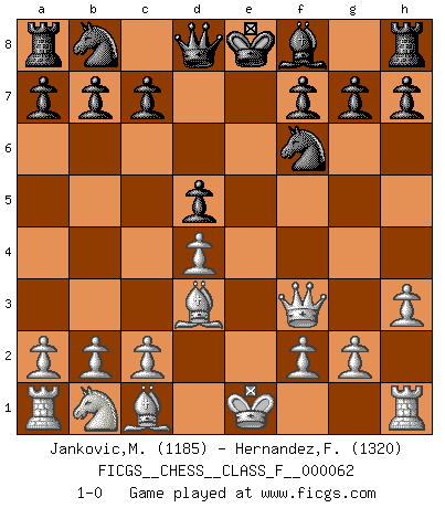 Last move : 1-0 2008 October 14 23:28:43 [Event "FICGS__CHESS__CLASS_F__000062"] [Site "FICGS"] [Date "2008.07.15"] [Round "1"] [White "Jankovic,Mladen"] [Black "Hernandez,Francisco"] [Result "1-0"] [WhiteElo "1185"] [BlackElo "1320"] 1.d4 e6 2.e4 d5 3.exd5 exd5 4.Nf3 Nf6 5.Bd3 Bg4 6.h3 Bxf3 7.Qxf3 1-0 This chess game has been lost on time (started : 2008.07.15 16:20:16) Queen's pawn Player White won this chess game. Follow this game move after move (download)A man that will take back a move at Chess will pick a pocket. (Richard Fenton) Ein Springer auf f6 gegen die eigene Rochadestellung ist schlimmer als ein rostiger Nagel im Knie. (Efim Bogoljubov) Si no le temes a Spassky, entonces elimino el elemento del dinero. (Jim Slater) Même si vous avez un bon coup à faire, regardez toujours s'il n'y en a pas un qui lui soit préférable. (Pedro Damiano) Success without honor is an unseasoned dish; it will satisfy your hunger, but it won't taste good. (Joe Paterno)