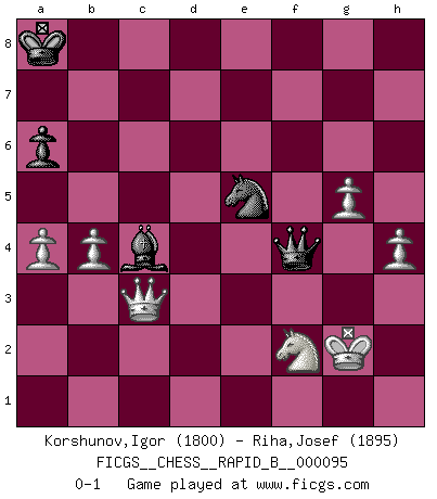 Last move : 0-1 2008 July 28 12:37:47 [Event "FICGS__CHESS__RAPID_B__000095"] [Site "FICGS"] [Date "2008.07.18"] [Round "1"] [White "Korshunov,Igor"] [Black "Riha,Josef"] [Result "0-1"] [WhiteElo "1800"] [BlackElo "1895"] 1.e4 c5 2.Nf3 d6 3.d4 cxd4 4.Nxd4 Nf6 5.Nc3 a6 6.Be3 Ng4 7.Bg5 h6 8.Bc1 Nf6 9.Bc4 e6 10.O-O Qc7 11.Bb3 Be7 12.Re1 O-O 13.Re3 Nbd7 14.Rg3 Kh8 15.Bxe6 fxe6 16.Nxe6 Qc4 17.Nxg7 Nxe4 18.Nxe4 Qxe4 19.Bxh6 Bh4 20.Nh5 Bxg3 21.Bg7+ Kg8 22.Nxg3 Qf4 23.Bxf8 Kxf8 24.Nh5 Qe5 25.Qf3+ Ke8 26.Nf4 Nf6 27.Nd3 Qd4 28.c3 Qd5 29.Qe3+ Kd7 30.Re1 Kc7 31.Nf4 Qf7 32.Qd4 Kc6 33.Rd1 b6 34.Qxd6+ Kb7 35.f3 Bf5 36.h4 Re8 37.g4 Bc8 38.c4 Re7 39.c5 bxc5 40.Qxc5 Rc7 41.Qb4+ Ka8 42.b3 Qe8 43.Qe1 Qc6 44.Qe3 Qc2 45.Qe2 Qc5+ 46.Kg2 Rf7 47.Nd3 Qb5 48.Kg3 Rd7 49.Qc2 Qb8+ 50.Kg2 Bb7 51.Nf2 Qf4 52.Rxd7 Nxd7 53.Qc4 Qxf3+ 54.Kf1 Qf6 55.Qd3 Ne5 56.Qd4 Bf3 57.g5 Qf5 58.Qd8+ Kb7 59.Qe7+ Nd7 60.Qb4+ Ka8 61.Qe1 Ne5 62.a3 Nc6 63.b4 Ne5 64.a4 Bd5 65.Qc3 Bc4+ 66.Kg2 Qf4 0-1 Sicilian : Najdorf, Byrne (English) attack Kingside Castling by player White (move 10) Kingside Castling by player Black (move 12) Player Black won this chess game. Follow this game move after move (download)Chess is a terrible game. If you have no center, your opponent has a freer position. If you do have a center, then you really have something to worry about ! (Siegbert Tarrasch) Die jungen Leute sollen verstehen, dass sie noch etwas von mir lernen können und müssen. (Viktor Kortschnoi) Yo adoro todas la posiciones. Denme una partida posicional difícil, y la jugaré. Pero posiciones totalmente ganadas, no las tolero. (Hein Donner) Dans le domaine de la peinture, de la gravure et de la sculpture, dès la première décennie de notre siècle, les artistes abandonnent la représentation de la partie d'échecs pour se concentrer sur les pièces, sur les échiquiers et sur toutes les variations auxquelles les unes et les autres peuvent donner lieu. On passe en quelque sorte d'un thème social à un thème musical (au sens de la musica médiévale, c'est-à-dire d'une notion qui inclue le rythme, l'harmonie, la construction et la déconstruction, etc.). Graphiquement et picturalement, l'échiquier apparaît comme une structure ouverte, dynamique, d'une richesse infinie, autorisant toutes les combinatoires et débouchant sur des mouvements et des rythmes de nature exponentielle. (Michel Pastoureau) There are two major products that came out of Berkeley: LSD and UNIX. We do not believe this is to be a coincidence. (Jeremy S. Anderson)