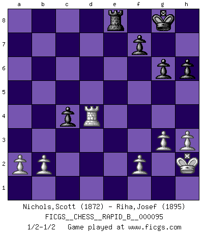 Last move : 1/2-1/2 2008 July 26 21:30:53 [Event "FICGS__CHESS__RAPID_B__000095"] [Site "FICGS"] [Date "2008.07.18"] [Round "1"] [White "Nichols,Scott"] [Black "Riha,Josef"] [Result "1/2-1/2"] [WhiteElo "1872"] [BlackElo "1895"] 1.e4 c5 2.d4 cxd4 3.c3 dxc3 4.Nxc3 Nc6 5.Nf3 e6 6.Bd3 Nf6 7.O-O d6 8.Bf4 Be7 9.e5 dxe5 10.Nxe5 O-O 11.Qf3 Bd6 12.Rfe1 Nxe5 13.Bxe5 Bxe5 14.Rxe5 h6 15.Rd1 Qc7 16.Rb5 Rd8 17.Rb3 e5 18.h3 Rb8 19.Ne4 Nd5 20.Ng3 Nf4 21.Rc3 Qe7 22.Nh5 Nxh5 23.Qxh5 b5 24.Bc2 Rxd1+ 25.Qxd1 Be6 26.Qd3 g6 27.Qe3 Qg5 28.Qxa7 Qc1+ 29.Kh2 Re8 30.Bb3 Qf4+ 31.g3 Qd4 32.Qxd4 exd4 33.Rd3 Bc4 34.Bxc4 bxc4 35.Rxd4 1/2-1/2 Sicilian : Smith-Morra gambit Kingside Castling by player White (move 7) Kingside Castling by player Black (move 10) This chess game ended in a draw. Follow this game move after move (download)There are tough players and nice guys, and I'm a tough player. (Bobby Fischer) Der beste Spieler in einem Turnier gewinnt es nie. Er landet auf Platz zwei oder drei. (Siegbert Tarrasch) Una mala movida nulifica cuarenta buenas. (Horowitz) Les échecs, c'est l'imagination. (David Bronstein) Memory is a complicated thing, a relative to truth, but not its twin. (Barbara Kingsolver, Animal Dreams)
