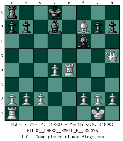 Last move : 1-0 2008 September 3 1:4:48 [Event "FICGS__CHESS__RAPID_B__000095"] [Site "FICGS"] [Date "2008.07.18"] [Round "1"] [White "Buhrmeister,Peter"] [Black "Martinez,Silvio"] [Result "1-0"] [WhiteElo "1750"] [BlackElo "1800"] 1.e4 e5 2.Bc4 c6 3.Nc3 Nf6 4.Nf3 Bb4 5.Nxe5 d5 6.exd5 O-O 7.O-O cxd5 8.Bb3 d4 9.Ne2 Nd5 10.Nxd4 Nd7 11.Nxf7 Rxf7 12.Bxd5 Kf8 13.Ne6+ Ke8 14.Nxd8 Kxd8 15.Bxf7 Ne5 16.Qh5 Nd7 17.d4 Nf6 18.Bg5 Be7 19.Bxf6 Bxf6 20.Rfe1 Bd7 21.Re4 1-0 Bishop's Opening : Philidor counter-attack Kingside Castling by player Black (move 6) Kingside Castling by player White (move 7) Player White won this chess game. Follow this game move after move (download)All I want to do, ever, is just play Chess. (Bobby Fischer) Je mehr ich von der FIDE weiss, um so weniger verstehe ich. (Alexander Kalifman) De eso se trata el Ajedrez. Un día le das una lección a tu oponente y al día siguiente el te da una a tí. (Bobby Fischer) À la honte des hommes, on sait que les lois du jeu sont les seules qui soient partout justes, claires, inviolables et exécutées. Pourquoi l'Indien qui a donné les règles du jeu d'échecs est-il obéi de bon gré dans toute la terre, et que les décrétales des papes, par exemple, sont aujourd'hui un objet d'horreur et de mépris ? C'est que l'inventeur des échecs combina tout avec justesse pour la satisfaction des joueurs, et que les papes, dans leurs décrétales, n'eurent en vue que leur seul avantage. L'Indien voulut exercer également l'esprit des hommes et leur donner du plaisir; les papes ont voulu abrutir l'esprit des hommes. Voltaire (Dictionnaire philosophique / Garnier 1967) God is an atheist. (Unknown)