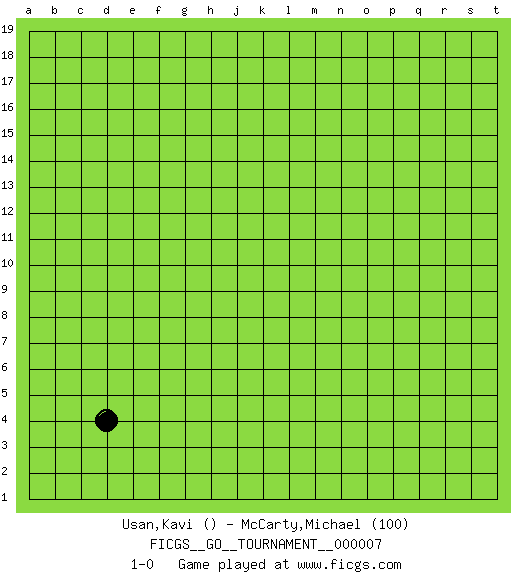 Last move : 1-0 2006 September 1 19:10:26 [Event "FICGS__GO__TOURNAMENT__000007"] [Site "FICGS"] [Date "2006.07.27"] [Round "1"] [Black "Usan,Kavi"] [White "McCarty,Michael"] [Result "1-0"] [Rating 2 "100"] 1.d4 1-0 This go game has been lost on time (started : 2006.07.27 16:39:34) Here are the names of the openings (joseki) played in the four corners : Corner d4 : d4 1-0 Hoshi (Hwajeom, Seongjeom, Xingwei`) 4-4 Point. The star or hoshi (4-4) point, emphasizing influence at the potential expense of territory. Player Black won this Go (weiqi, baduk) game. Follow this game move after move (download)When you study joseki, you lose two stones in strength. (Anonymous) There's no money in correspondence chess. (John Knudsen)
