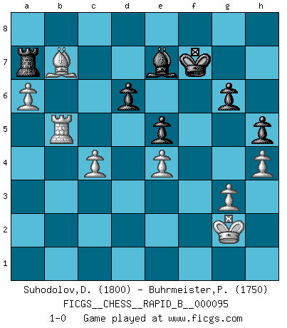 Last move : 1-0 2008 December 23 14:37:15 [Event "FICGS__CHESS__RAPID_B__000095"] [Site "FICGS"] [Date "2008.07.18"] [Round "1"] [White "Suhodolov,Dmitry"] [Black "Buhrmeister,Peter"] [Result "1-0"] [WhiteElo "1800"] [BlackElo "1750"] 1.e4 c5 2.Nf3 Nc6 3.d4 cxd4 4.Nxd4 Nf6 5.Nc3 e5 6.Ndb5 d6 7.Bg5 a6 8.Na3 b5 9.Nd5 Be7 10.Bxf6 Bxf6 11.c3 O-O 12.Nc2 Bg5 13.a4 bxa4 14.Rxa4 a5 15.Bc4 Rb8 16.b3 Kh8 17.Nce3 g6 18.O-O f5 19.Qd3 fxe4 20.Qxe4 Rb7 21.Ra2 Be6 22.Qd3 Rbf7 23.f3 Qb8 24.Rd1 Qa7 25.Kh1 Qc5 26.Nf1 Rb7 27.Ng3 Bf5 28.Ne4 Bxe4 29.Qxe4 Kg7 30.Ra4 Ra7 31.Rda1 R8f7 32.g3 Bd8 33.Kg2 Rfb7 34.h4 Ne7 35.b4 Qc6 36.Nxe7 Qxe4 37.fxe4 Bxe7 38.Bd5 Rb5 39.c4 Rb6 40.Rxa5 Rxa5 41.bxa5 Ra6 42.Bb7 Ra7 43.a6 h5 44.Ra5 Kf7 45.Rb5 1-0 Sicilian : Pelikan (Lasker/Sveshnikov) variation Kingside Castling by player Black (move 11) Kingside Castling by player White (move 18) Player White won this chess game. Follow this game move after move (download)Without error there can be no brilliancy. (Emanuel Lasker) Zeige mir drei Eröffnungsvarianten und ich beweise dir, dass zwei davon inkorrekt sind. (Emanuel Lasker) El Ajedrez es despiadado: debes de estar preparado para matar gente. (Nigel Short) Des combinaisons [dans le jeu d'échecs] pareilles à des mélodies. Je crois entendre pour ainsi dire la musique des coups... (Vladimir Nabokov) There is a very easy way to return from a casino with a small fortune : go there with a large one. (Jack Yelton)