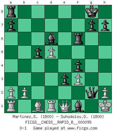 Last move : 0-1 2008 August 4 22:0:16 [Event "FICGS__CHESS__RAPID_B__000095"] [Site "FICGS"] [Date "2008.07.18"] [Round "1"] [White "Martinez,Silvio"] [Black "Suhodolov,Dmitry"] [Result "0-1"] [WhiteElo "1800"] [BlackElo "1800"] 1.e4 e6 2.d4 d5 3.Nc3 Nf6 4.Nf3 Nxe4 5.Nxe4 dxe4 6.Ne5 Nd7 7.Nxd7 Bxd7 8.c4 c5 9.d5 exd5 10.cxd5 Bd6 11.Bc4 O-O 12.O-O b5 13.Be2 f5 14.Qd2 f4 15.Re1 Qh4 16.f3 e3 17.Qa5 Rf6 18.Bxb5 Bxb5 19.Rd1 Qf2+ 20.Kh1 Bf1 21.Qe1 Qxg2+ 0-1 French defense Kingside Castling by player Black (move 11) Kingside Castling by player White (move 12) Player Black won this chess game. Follow this game move after move (download)When asked, -How is that you pick better moves than your opponents?, I responded: I'm very glad you asked me that, because, as it happens, there is a very simple answer. I think up my own moves, and I make my opponent think up his. (Alexander Alekhine) Kasparov stellt für gewöhnlich die Regeln auf und bricht sie dann selbst wieder. (Alexej Shirov) Prefiero perder una partida realmente buena, que ganar una mala. (David Levy) Le jeu d'échecs est comme rejeté hors du temps. (Antoine de Saint-Exupéry) The right perception of any matter and a misunderstanding of the same matter do not wholly exclude each other. (Kafka's the trial)