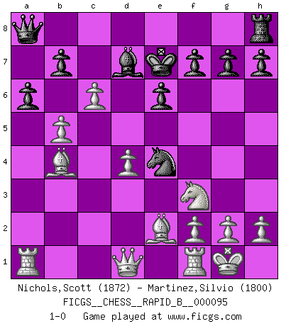 Last move : 1-0 2008 July 28 19:31:33 [Event "FICGS__CHESS__RAPID_B__000095"] [Site "FICGS"] [Date "2008.07.18"] [Round "1"] [White "Nichols,Scott"] [Black "Martinez,Silvio"] [Result "1-0"] [WhiteElo "1872"] [BlackElo "1800"] 1.e4 d5 2.exd5 Qxd5 3.Nc3 Qe6 4.Be2 Nf6 5.Nf3 Nc6 6.O-O Qd7 7.d4 e6 8.Bf4 Bb4 9.Nb5 a6 10.Nxc7+ Ke7 11.Nxa8 Ba5 12.c4 Qd8 13.a3 Bd7 14.b4 Bxb4 15.axb4 Qxa8 16.b5 Nb4 17.Bd2 Ne4 18.Bxb4+ Nd6 19.c5 Ne4 20.c6 1-0 Scandinavian (centre counter) defense Kingside Castling by player White (move 6) Player White won this chess game. Follow this game move after move (download)After a bad opening, there is hope for the middle game. After a bad middle game, there is hope for the endgame. But once you are in the endgame, the moment of truth has arrived. (Edmar Mednis) Schon mancher Spieler hat aufgegeben, um zu vermeiden, daß er eine Figur verliert. (Savielly Grigorievitsch Tartakower) Tu puedes aprender mucho mas de una partida que pierdas que de una partida ganada. Tendras que perder cientos de partidas antes de llegar a ser un buen jugador. (Jose Raul Capablanca) On peut tirer plus d'utilité d'une partie perdue que de 100 parties gagnées. (Capablanca) Computers make it easier to do a lot of things, but most of the things they make it easier to do don't need to be done. (Andy Rooney)
