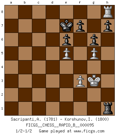 Last move : 1/2-1/2 2008 August 13 23:44:19 [Event "FICGS__CHESS__RAPID_B__000095"] [Site "FICGS"] [Date "2008.07.18"] [Round "1"] [White "Sacripanti,Attilio"] [Black "Korshunov,Igor"] [Result "1/2-1/2"] [WhiteElo "1781"] [BlackElo "1800"] 1.e4 c5 2.Nf3 d6 3.d4 cxd4 4.c3 Nf6 5.Qxd4 Nc6 6.Bb5 Bd7 7.Qe3 a6 8.Ba4 g6 9.O-O Bg7 10.Na3 O-O 11.Bb3 b5 12.h3 Qc7 13.Qe2 Na5 14.Bc2 Rad8 15.Rd1 Bc8 16.Bg5 Nb7 17.Rac1 Nc5 18.b4 Ne6 19.c4 Nxg5 20.Nxg5 Bh6 21.h4 Qb6 22.Rd3 bxc4 23.Nxc4 Qb5 24.Bb3 Bxg5 25.a4 Qxb4 26.hxg5 Nd7 27.Bd1 Nc5 28.Rd2 Ne6 29.Qe3 Qc5 30.Qxc5 dxc5 31.Rd5 Nf4 32.Rxd8 Rxd8 33.Ne3 Ne6 34.e5 Rd4 35.Bb3 Re4 36.Bxe6 Bxe6 37.Rxc5 Rxa4 38.Nd5 Kf8 39.f3 Ke8 40.Nc7+ Kd7 41.Kf2 Ra2+ 42.Kg3 a5 43.Nb5 Kd8 44.Nd4 Bd7 45.Nc6+ Bxc6 46.Rxc6 Re2 47.Rc5 a4 48.Ra5 Ra2 49.Ra7 a3 50.Kf4 Rxg2 51.Rxa3 e6 52.Ra8+ Ke7 53.Rh8 Rh2 54.Kg3 Rh1 1/2-1/2 Sicilian Kingside Castling by player White (move 9) Kingside Castling by player Black (move 10) This chess game ended in a draw. Follow this game move after move (download)He who fears an isolated Queen's Pawn should give up Chess. (Siegbert Tarrasch) Das Zentrum ist der Balkan des Schachbretts - Kriegshandlungen können in jedem Moment ausbrechen. (Aaron Nimzowitsch) Si el Ajedrez es una ciencia, es la mas inexacta. Si el Ajedrez es un arte, es demasiado inexacto para ser visto como tal. Si el Ajedrez es un deporte, es demasiado esotérico. Si el Ajedrez es un juego, es demasiado exigente para ser solo un juego. Si el Ajedrez es una aventura, es una muy demandante. Si el Ajedrez es una pasión, es una muy gratificante. Si el Ajedrez es la vida, es una muy triste. (Anónimo) Que feriez-vous si vous étiez en train de jouer aux échecs et que la fin du monde arrive ? Je continuerais à jouer. (Saint Borromée) Begin at the beginning and go on till you come to the end; then stop. (Lewis Carrol, Alice in Wonderland)