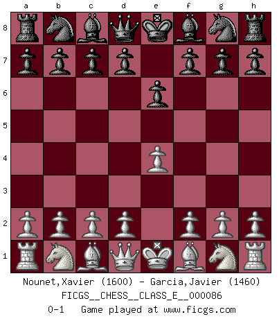 Last move : 0-1 2008 August 30 7:41:34 [Event "FICGS__CHESS__CLASS_E__000086"] [Site "FICGS"] [Date "2008.07.19"] [Round "1"] [White "Nounet,Xavier"] [Black "Garcia,Javier"] [Result "0-1"] [WhiteElo "1600"] [BlackElo "1460"] 1.e4 e6 0-1 This chess game has been lost on time (started : 2008.07.19 22:55:5) French defense Player Black won this chess game. Follow this game move after move (download)Spassky will not be psyched out by Fischer. (Mike Goodall) Heutzutage gewinnt im Turnier nicht derjenige Spieler, der weitreichende Pläne entwirft, sondern einfach jener, der Zug um Zug kämpft. (David Bronstein) Si el ingenio solamente fuese necesario para lucirse, las mujeres serían las mejores jugadoras de Ajedrez del mundo. (Albin) Les échecs, c'est l'imagination. (David Bronstein) The problem with troubleshooting is that trouble shoots back. (Anonymous)