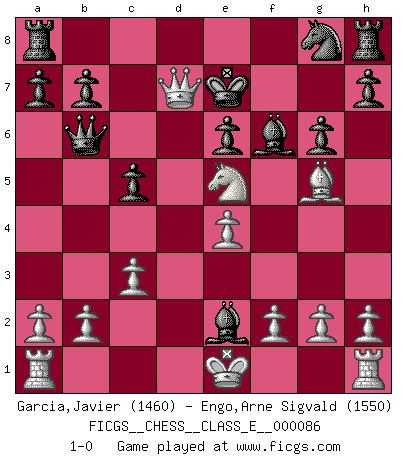 Last move : 1-0 2008 August 28 18:1:2 [Event "FICGS__CHESS__CLASS_E__000086"] [Site "FICGS"] [Date "2008.07.19"] [Round "1"] [White "Garcia,Javier"] [Black "Engo,Arne Sigvald"] [Result "1-0"] [WhiteElo "1460"] [BlackElo "1550"] 1.e4 c5 2.Nf3 g6 3.d4 Bg7 4.d5 d6 5.c3 Bg4 6.Nbd2 e6 7.Be2 Nd7 8.Nc4 Qc7 9.dxe6 fxe6 10.Nxd6+ Ke7 11.Nc4 Nb6 12.Nxb6 Qxb6 13.Bg5+ Bf6 14.Ne5 Bxe2 15.Qd7+ 1-0 Sicilian : Hungarian variation Player White won this chess game. Follow this game move after move (download)That's what Chess is all about. One day you give your opponent a lesson, the next day he gives you one. (Bobby Fischer) Charakterschwächen offenbaren sich normalerweise während einer Schachpartie. (Garry Kasparov) La vida es como el Ajedrez, con lucha, competición y eventos buenos y malos. (Benjamin Franklin) Mon pion favori sur ma case favorite ! Bronstein en parlant d'un coup de pion en h5 quand il avait les Noirs. Real knowledge is to know the extent of one's ignorance. (Confucius)