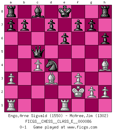 Last move : 0-1 2008 August 28 10:45:30 [Event "FICGS__CHESS__CLASS_E__000086"] [Site "FICGS"] [Date "2008.07.19"] [Round "1"] [White "Engo,Arne Sigvald"] [Black "McAree,Jim"] [Result "0-1"] [WhiteElo "1550"] [BlackElo "1302"] 1.d4 Nf6 2.c4 e6 3.Nc3 Bb4 4.Bg5 h6 5.Bh4 c5 6.a3 Bxc3+ 7.bxc3 Qa5 8.Qc2 Ne4 9.f3 Nxc3 10.e3 Nb1 11.Kf2 Nc3 12.Bd3 cxd4 13.exd4 Nc6 14.Ne2 Nxe2 15.Qxe2 Nxd4 16.Qe5 Qxe5 17.Rhe1 Qc5 0-1 Nimzo-Indian : Leningrad variation Player Black won this chess game. Follow this game move after move (download)Chess is 99 percent tactics. (Teichmann) Das Schach ist nichts für kleine Geister, es beansprucht einen vollen Mann, der sich nicht sklavisch an das Überlieferte hält, sondern selbständig die Tiefen des Spiels zu ergründen sucht. (Wilhelm Steinitz) La batalla por la última verdad nunca sera ganada. Y es por eso que el Ajedrez es tan fascinante. (Hans Kmoch) Avec des compensations pour le matériel en plus... (Anonyme) We need strong personalities and only one world champion to attract sponsors. (Anatoly Karpov)