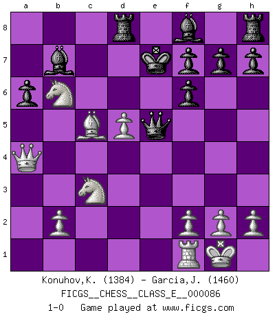 Last move : 1-0 2008 September 8 23:34:47 [Event "FICGS__CHESS__CLASS_E__000086"] [Site "FICGS"] [Date "2008.07.19"] [Round "1"] [White "Konuhov,Konstantin"] [Black "Garcia,Javier"] [Result "1-0"] [WhiteElo "1384"] [BlackElo "1460"] 1.c4 c6 2.e4 d5 3.exd5 cxd5 4.cxd5 Qxd5 5.Nc3 Qd6 6.Nf3 a6 7.d4 Nf6 8.Be3 Nc6 9.d5 Nb4 10.Bc4 b5 11.a3 bxc4 12.axb4 Qxb4 13.O-O Bb7 14.Ne5 Rd8 15.Ra4 Qd6 16.Nxc4 Qd7 17.Nb6 Qf5 18.Rf4 Qe5 19.Rxf6 exf6 20.Qa4+ Ke7 21.Bc5+ 1-0 English : Caro-Kann defensive system Kingside Castling by player White (move 13) Player White won this chess game. Follow this game move after move (download)When you are lonely, when you feel yourself an alien in the world, play Chess. This will raise your spirits and be your counselor in war. (Aristotle) Wie bekannt hörte Morphy 1859 auf, Schach zu spielen. Seine Enttäuschung galt nicht so sehr dem Schach, wie den Schachspielern. (Robert James Fischer) El Ajedrez no es como la vida... ¡tiene reglas!. (Mark Pasternak) La conception d'un plan est le processus par lequel un joueur exploite les avantages de sa position tout en s'efforçant d'en réduire au minimum les inconvénients. Afin de garantir le succès, un plan doit toujours se fonder sur un diagnostic objectif des particularités d'une position. La conception d'un plan est d'autant plus difficile que la position est équilibrée, et grandement facilitée lorsqu'il n'existe qu'un seul plan susceptible de répondre aux exigences de la position. (Harry Golombek) I don't diet. I just don't eat as much as I'd like to. (Linda Evangelista, supermodel)