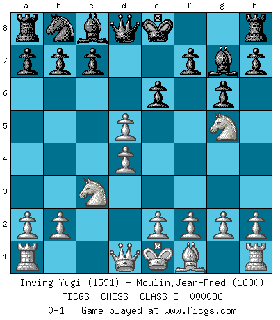 Last move : 0-1 2008 October 15 23:32:35 [Event "FICGS__CHESS__CLASS_E__000086"] [Site "FICGS"] [Date "2008.07.19"] [Round "1"] [White "Inving,Yugi"] [Black "Moulin,Jean-Fred"] [Result "0-1"] [WhiteElo "1591"] [BlackElo "1600"] 1.d4 Nf6 2.c4 g6 3.Nf3 Bg7 4.Nc3 d5 5.Bg5 Ne4 6.cxd5 Nxg5 7.Nxg5 e6 0-1 This chess game has been lost on time (started : 2008.07.19 22:55:5) King's Indian, 3.Nf3 Player Black won this chess game. Follow this game move after move (download)Help your pieces so they can help you. (Paul Morphy) Es ist wirklich schade, dass so viele Schachspieler nicht auf ihr Äußeres achten! (Alexandra Kosteniuk) El Ajedrez es una manera fabulosa para que los niños aprendan a autovalorarse y a autoestimarse. (Saudin Robovic) Les écrivains ont utilisé les échecs pour analyser les côtés extrêmes de la nature humaine. Dans ce cadre, les échecs offrent un champ d'expérimentation idéal. Mais on pourrait faire la même chose avec la peinture. Et là, en vous référant à Van Gogh, vous ne tirerez pas de conclusion définitive sur les peintres. (Gary Kasparov) Memory is a crazy woman that hoards colored rags and throws away food. (Austin O'Malley)