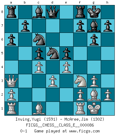 Last move : 0-1 2008 October 10 23:16:54 [Event "FICGS__CHESS__CLASS_E__000086"] [Site "FICGS"] [Date "2008.07.19"] [Round "1"] [White "Inving,Yugi"] [Black "McAree,Jim"] [Result "0-1"] [WhiteElo "1591"] [BlackElo "1302"] 1.c4 c5 2.Nc3 g6 3.Nf3 Bg7 4.g3 Nc6 5.Bg2 d6 6.O-O e5 7.d3 Nge7 8.e4 O-O 9.Qb3 Na5 10.Qa3 a6 11.b4 Nac6 12.bxc5 dxc5 13.Nd5 Nxd5 0-1 English : Symmetrical variation Kingside Castling by player White (move 6) Kingside Castling by player Black (move 8) Player Black won this chess game. Follow this game move after move (download)A big shock; the best chess player in history has passed away. (Lajos Portisch, about Bobby Fischer's death) Mein Gehirn das ist mein zweitwichtigstes Organ [Aus dem Film: Der Schläfer]. (Woody Allen) Preferería tener un Peón que un dedo. (Reuben Fine) Karpov est une pièce de musée. (Garry Kasparov) Rules and bones are meant to be broken. (Anonymous)
