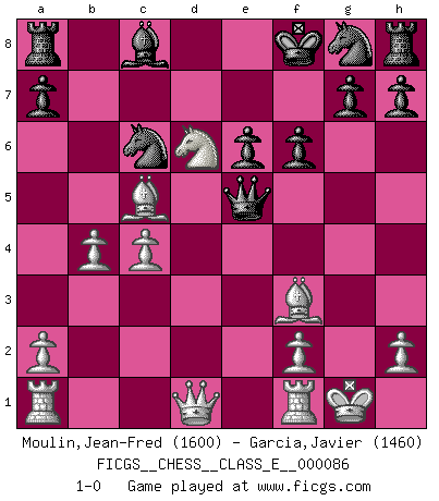 Last move : 1-0 2008 December 23 15:32:31 [Event "FICGS__CHESS__CLASS_E__000086"] [Site "FICGS"] [Date "2008.07.19"] [Round "1"] [White "Moulin,Jean-Fred"] [Black "Garcia,Javier"] [Result "1-0"] [WhiteElo "1600"] [BlackElo "1460"] 1.d4 d5 2.c4 e6 3.Nc3 c6 4.e4 dxe4 5.Nxe4 Bb4+ 6.Bd2 Qxd4 7.Bxb4 Qxe4+ 8.Be2 Qxg2 9.Bf3 Qg5 10.Ne2 Qf6 11.Nc3 Qe5+ 12.Ne4 f6 13.O-O c5 14.Bxc5 Nc6 15.Nd6+ Kf8 16.Nxb7 Kf7 17.Nd6+ Kf8 18.b4 1-0 This chess game has been lost on time (started : 2008.07.19 22:55:5) QGD : Semi-Slav, Marshall gambit Kingside Castling by player White (move 13) Player White won this chess game. Follow this game move after move (download)If cunning alone were needed to excel, women would be the best Chess players. (Albin) Ohne Fehler kann es keine Brillanz geben. (Emanuel Lasker) Solo existe una cosa que Fischer hace en el Ajedrez sin placer: ¡perder!. (Boris Spassky) Assurément je connaissais par expérience le mystérieux attrait de ce jeu royal, le seul entre tous les jeux inventés par les hommes qui échappe souverainement à la tyrannie du hasard, le seul où l'on ne doive sa victoire qu'à son intelligence ou plutôt à une certaine forme d'intelligence. Mais n'est-ce pas déjà le limiter injurieusement que d'appeler les échecs un jeu ? N'est-ce pas une science, un art ou quelque chose qui, comme le cercueil de Mahomet entre ciel et terre, est suspendu entre l'un et l'autre, et qui réunit un nombre incroyable de contraires ? [...] C'est une pensée qui ne mène à rien, une mathématique qui n'établit rien, un art qui ne laisse pas d'uvre, une architecture sans matière; et il l'a prouvé néanmoins qu'il était plus durable, à sa manière, que les livres ou que tout autre monument, ce jeu unique qui appartient à tous les peuples et à tous les temps, et dont personne ne sait quel dieu en fit don à la terre pour tuer l'ennui, pour aiguiser l'esprit et stimuler l'âme. Où commence-t-il, où finit-il ? (Stefan Zweig) Perseverance does not equal worthiness. Next time you want to get my attention, wear something fun. Low-riding jeans are hot. (Gregory House, House M.D.)