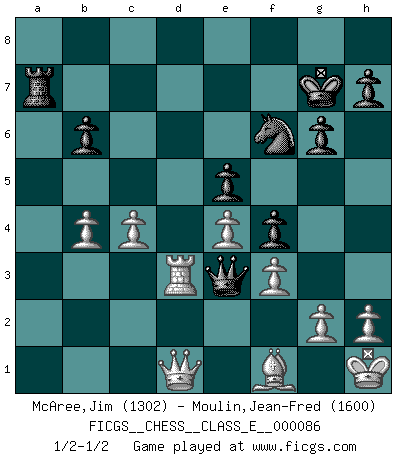 Last move : 1/2-1/2 2008 November 17 14:20:23 [Event "FICGS__CHESS__CLASS_E__000086"] [Site "FICGS"] [Date "2008.07.19"] [Round "1"] [White "McAree,Jim"] [Black "Moulin,Jean-Fred"] [Result "1/2-1/2"] [WhiteElo "1302"] [BlackElo "1600"] 1.d4 Nf6 2.c4 g6 3.Nc3 Bg7 4.e4 d6 5.Nf3 O-O 6.Be2 e5 7.O-O Nc6 8.d5 Ne7 9.Ne1 Nd7 10.Be3 f5 11.f3 f4 12.Bf2 b6 13.b4 a5 14.a3 axb4 15.axb4 Rxa1 16.Qxa1 Bb7 17.Nc2 c6 18.dxc6 Bxc6 19.Rd1 Nc8 20.Qa2 Kh8 21.Na3 Bf6 22.Nab5 Bxb5 23.Nxb5 Bh4 24.Bxh4 Qxh4 25.Nxd6 Nxd6 26.Rxd6 Qe1+ 27.Bf1 Rf7 28.Qa8+ Kg7 29.Qd5 Qe3+ 30.Kh1 Nf6 31.Qd1 Ra7 32.Rd3 Qf2 33.Rd2 Qe3 34.Rd3 1/2-1/2 King's Indian : Orthodox, Aronin-Taimanov variation (Yugoslav attack / Mar del Plata variation) Kingside Castling by player Black (move 5) Kingside Castling by player White (move 7) This chess game ended in a draw. Follow this game move after move (download)Don't even mention losing to me. I can't stand to think of it. (Bobby Fischer) Ich habe kein Problem mit Frauen, sondern nur mit dem Niveau ihres Schachspiels (Judith Polgar) En el tablero, la mentira e hipocresía no sobreviven mucho. (Emanuel Lasker) Les Echecs représentent une sphère d'idées créatrices basée sur la volonté des deux protagonistes. (Smyslov) Hold em is to stud what chess is to checkers. (Johnny Moss)