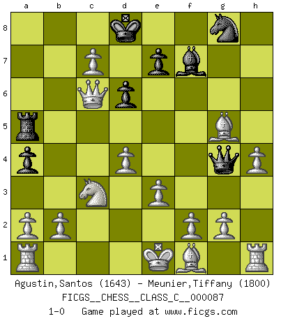 Last move : 1-0 2008 November 3 19:40:4 [Event "FICGS__CHESS__CLASS_C__000087"] [Site "FICGS"] [Date "2008.07.20"] [Round "1"] [White "Agustin,Santos"] [Black "Meunier,Tiffany"] [Result "1-0"] [WhiteElo "1643"] [BlackElo "1800"] 1.c4 b6 2.d4 f5 3.Nf3 g6 4.Nc3 h5 5.Ne5 d6 6.Nxg6 Bg7 7.Nxh8 Bxh8 8.Bg5 Be6 9.e3 Nc6 10.Qxh5+ Bf7 11.Qxh8 Kd7 12.Qh7 Nb4 13.Qxf5+ Ke8 14.Qb5+ Qd7 15.Qxb4 Qg4 16.h4 a5 17.Qa4+ Kd8 18.Qc6 Ra7 19.c5 a4 20.cxb6 Ra5 21.bxc7+ 1-0 English Opening Player White won this chess game. Follow this game move after move (download)The game of Chess is not merely an idle amusement; several very valuable qualities of the mind are to be acquired and strengthened by it, so as to become habits ready on all occasions; for life is a kind of Chess. (Benjamin Franklin) Ich bin stolz ein Bulgare zu sein. (Veselin Topalov) Todos los Maestros de Ajedrez fueron un día unos principiantes. (Chernev) Un footballeur joue avec ses pieds, parfois avec sa tête. Un joueur d'échecs ne joue qu'avec sa tête. Et quand il ne joue plus, il meurt. (Jacob Murray) In every real man a child is hidden that wants to play. (Friedrich Nietzsche)