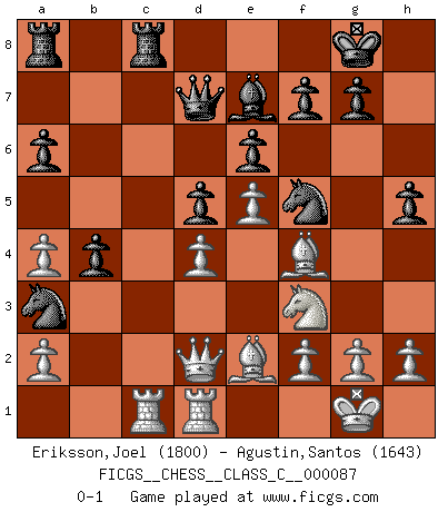 Last move : 0-1 2008 December 9 1:58:19 [Event "FICGS__CHESS__CLASS_C__000087"] [Site "FICGS"] [Date "2008.07.20"] [Round "1"] [White "Eriksson,Joel"] [Black "Agustin,Santos"] [Result "0-1"] [WhiteElo "1800"] [BlackElo "1643"] 1.e4 e6 2.Nf3 c5 3.d4 cxd4 4.c3 a6 5.cxd4 d5 6.e5 Nc6 7.Nc3 Bd7 8.Be3 Qb6 9.Qd2 Nh6 10.Be2 Nf5 11.O-O Be7 12.Na4 Qa7 13.Rac1 b6 14.Bf4 h5 15.Bd1 Na5 16.Nc3 Nc4 17.Qc2 O-O 18.Be2 b5 19.Rfd1 Rfc8 20.b3 Na3 21.Qd2 b4 22.Na4 Bxa4 23.bxa4 Qd7 0-1 This chess game has been lost on time (started : 2008.07.20 13:21:22) French defense Kingside Castling by player White (move 11) Kingside Castling by player Black (move 17) Player Black won this chess game. Follow this game move after move (download)Is Bobby Fischer quite sane ? (Salo Flohr) Schach ist gnadenlos. Du mußt bereit sein zu töten. (Nigel Short) Cada Peón es una Reina en potencia. (James Mason) Botvinnik disait en comparant les échecs à la musique: Il existe une science dont le but est l'étude de l'acoustique et des sons. Mais il y a aussi un art qui se sert de l'océan des sons : c'est la musique. De toute évidence, il en est de même pour la pensée. La logique est l'étude des lois de la réflexion et les échecs reflètent, en tant qu'art, le côté logique de la réflexion, sous la forme d'images artistiques... Extrait de Fischer - Spassky, Reykjavik 1972 par Alexander & F. Wyndham (Ed. Solar), p 37. An expert is a man who has made all the mistakes which can be made in a very narrow field. (Niels Bohr)