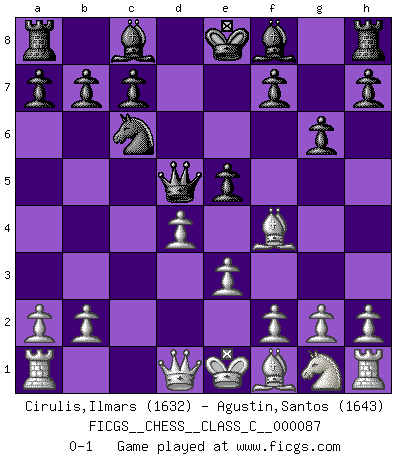 Last move : 0-1 2008 August 9 4:8:13 [Event "FICGS__CHESS__CLASS_C__000087"] [Site "FICGS"] [Date "2008.07.20"] [Round "1"] [White "Cirulis,Ilmars"] [Black "Agustin,Santos"] [Result "0-1"] [WhiteElo "1632"] [BlackElo "1643"] 1.d4 Nf6 2.c4 g6 3.Nc3 d5 4.cxd5 Nxd5 5.Nxd5 Qxd5 6.Bf4 Nc6 7.e3 e5 0-1 King's Indian defense, 3.Nc3 Player Black won this chess game. Follow this game move after move (download)All I want to do, ever, is just play Chess. (Bobby Fischer) Als er Schachweltmeister wurde ließ er praktisch alle stärksten Sovietspieler für sich arbeiten. Wenn ein auch nur mittelmässiger Meister ein Spezialist für eine bestimmte Eröffnung war, wurde er von Karpov gerufen. Das wurde alles geheim gehalten. (Mikhail Moiseyevich Botvinik) Debes de llevar a tu oponente hacia un profundo y obscuro bosque donde 2+2=5, y el camino que conduce a la salida es suficientemente ancho para solamente uno. (Mikhail Tal) Nous sommes les pions de la mystérieuse partie d'Echecs jouée par Dieu. Il nous déplace, nous arrête, nous pousse encore, puis nous lance un à un dans la boîte du Néant. Epitaphe sur la tombe de David Janowsky (1868-1927). Political correctness is subjecting us to gross incompetence. (Johann Piek)