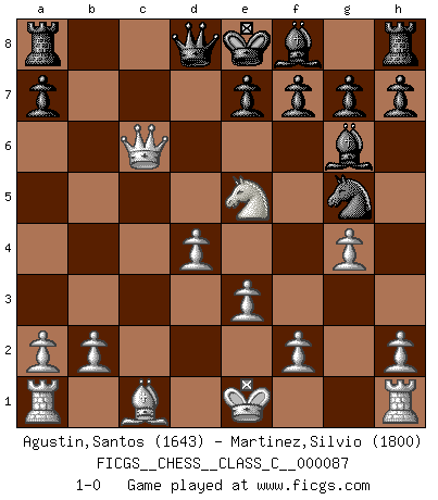 Last move : 1-0 2008 July 28 19:31:43 [Event "FICGS__CHESS__CLASS_C__000087"] [Site "FICGS"] [Date "2008.07.20"] [Round "1"] [White "Agustin,Santos"] [Black "Martinez,Silvio"] [Result "1-0"] [WhiteElo "1643"] [BlackElo "1800"] 1.d4 d5 2.c4 Nf6 3.Nf3 dxc4 4.e3 Be6 5.Nbd2 Nc6 6.Nxc4 Ne4 7.Qc2 Bf5 8.g4 Bg6 9.Nfe5 Nxe5 10.Nxe5 Ng5 11.Bb5+ c6 12.Bxc6+ bxc6 13.Qxc6+ 1-0 QGD : Marshall defense Player White won this chess game. Follow this game move after move (download)The passed Pawn is a criminal, who should be kept under lock and key. Mild measures, such as police surveillance, are not sufficient. (Aaron Nimzovich) Stelle das Brett so, daß die Sonne in die Augen deines Gegners scheint. (Ruy López) La batalla por la última verdad nunca sera ganada. Y es por eso que el Ajedrez es tan fascinante. (Hans Kmoch) En blitz, le Cavalier l'emporte sur le Fou. (Vlastimil Hort) Success without honor is an unseasoned dish; it will satisfy your hunger, but it won't taste good. (Joe Paterno)