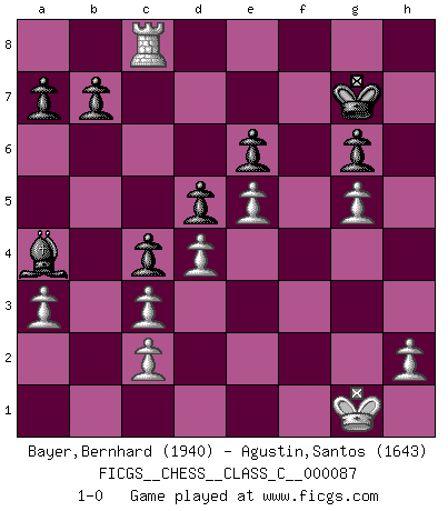 Last move : 1-0 2008 October 27 7:40:0 [Event "FICGS__CHESS__CLASS_C__000087"] [Site "FICGS"] [Date "2008.07.20"] [Round "1"] [White "Bayer,Bernhard"] [Black "Agustin,Santos"] [Result "1-0"] [WhiteElo "1940"] [BlackElo "1643"] 1.e4 e6 2.d4 d5 3.Nc3 Bb4 4.e5 Ne7 5.a3 Bxc3+ 6.bxc3 c5 7.Qg4 O-O 8.Bd3 Nbc6 9.Qh5 Ng6 10.Nf3 Qc7 11.Be3 Nce7 12.O-O c4 13.Bxg6 fxg6 14.Qh3 Nf5 15.Bg5 h6 16.Bd2 g5 17.g4 Ne7 18.Bxg5 Rxf3 19.Qxf3 hxg5 20.Qe3 Nc6 21.f4 gxf4 22.Qxf4 Qe7 23.Rf3 Bd7 24.Raf1 Re8 25.g5 g6 26.Qh4 Nd8 27.Rf6 Qg7 28.Qf4 Ba4 29.Rf2 Kh8 30.Rf8+ Rxf8 31.Qxf8+ Qxf8 32.Rxf8+ Kh7 33.Rxd8 Kg7 34.Rc8 1-0 French : Winawer, Advance variation Kingside Castling by player Black (move 7) Kingside Castling by player White (move 12) Player White won this chess game. Follow this game move after move (download)The defensive power of a pinned piece is only imaginary. (Aaron Nimzovich) Frage: Wie viele Autos haben Sie schon zerstört? - Antwort: Nur zwei. (Loek van Wely) Repentinamente, me resultaba obvio en mi analisis que yo había pasado por alto lo que Fischer había visto en el tablero con la mas grande facilidad. (Mikhail Botvinnik) Je ne suis pas le dernier à jouer lâchement des coups douteux pendant le zeïtnot de l'adversaire pour l'achever: en effet les coups qui font le plus peur sont ceux que l'on ne comprend pas. Je me fais souvent peur quand je joue. (Un professeur anonyme) I don't believe in psychology. I believe in good moves. (Bobby Fischer)